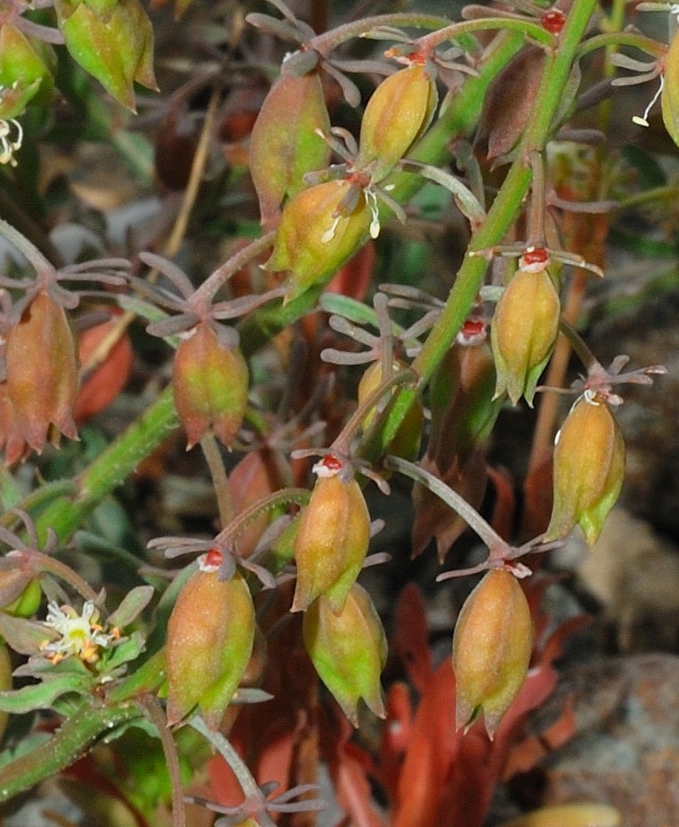 Früchte 7 - 12 mm lang, 5 - 7 mm breit, eikugelig, kahl, mit 3 Schnäbeln, Schnäbel 9,5 - 2 mm lang, schwach kantig, zur Fruchtreife hängend
