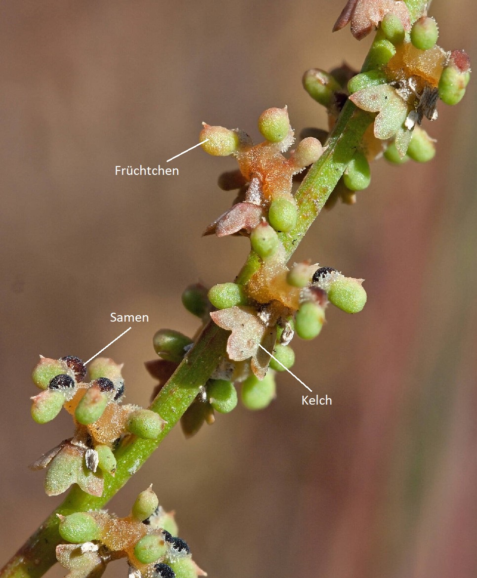 Früchtchen aufgeblasen, sternförmig von der Blütenbodenscheibe abstehend, jedes Früchtchen enthält nur 1 dunkelbraunen bis schwarzen Samen, Samen ca. 1mm lang, mit sehr kleinen und weit auseinanderstehenden Papillen