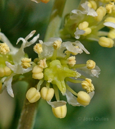Blüten etwas zygomorph, mit meist 5 weiße bis cremefarbenen, mehrzipfigen Kronblättern und 9 - 15 Staubblättern, Staubbeutel +/- orange
