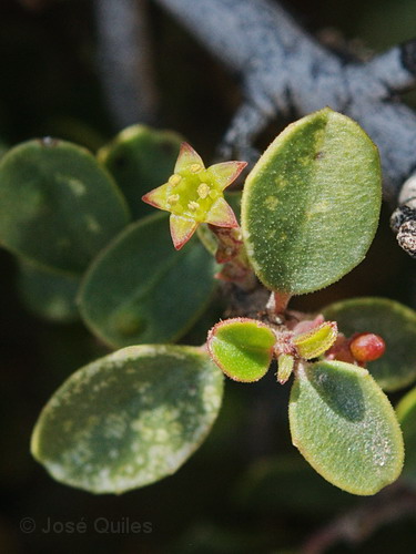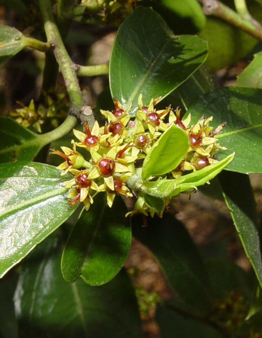 Blätter immergrün, 5 - 15 mm lang, 6 - 9 mm breit, oval, ledrig, gestielt
