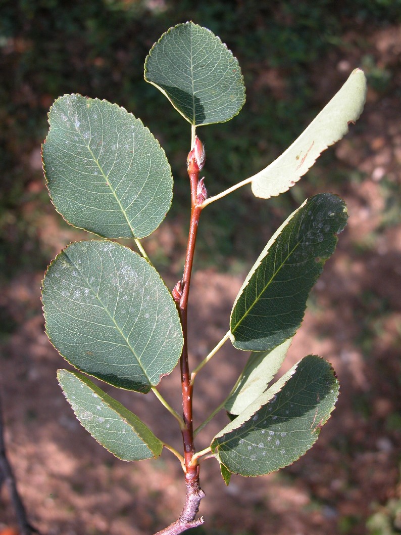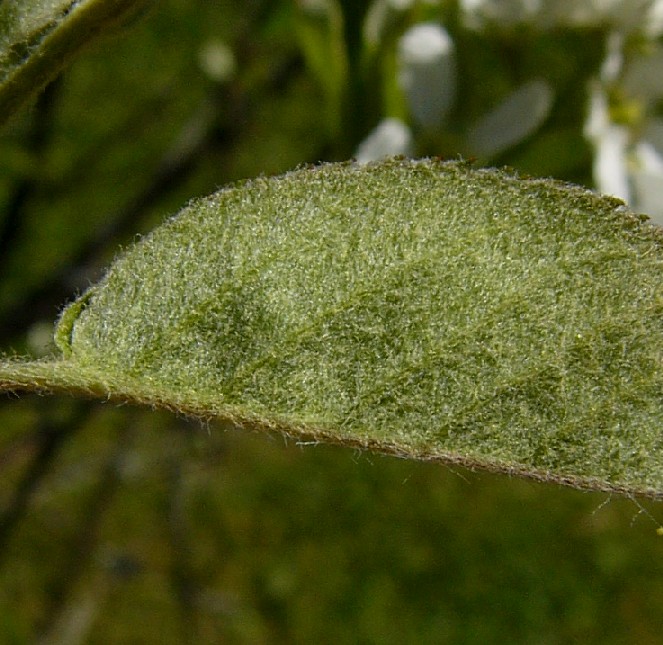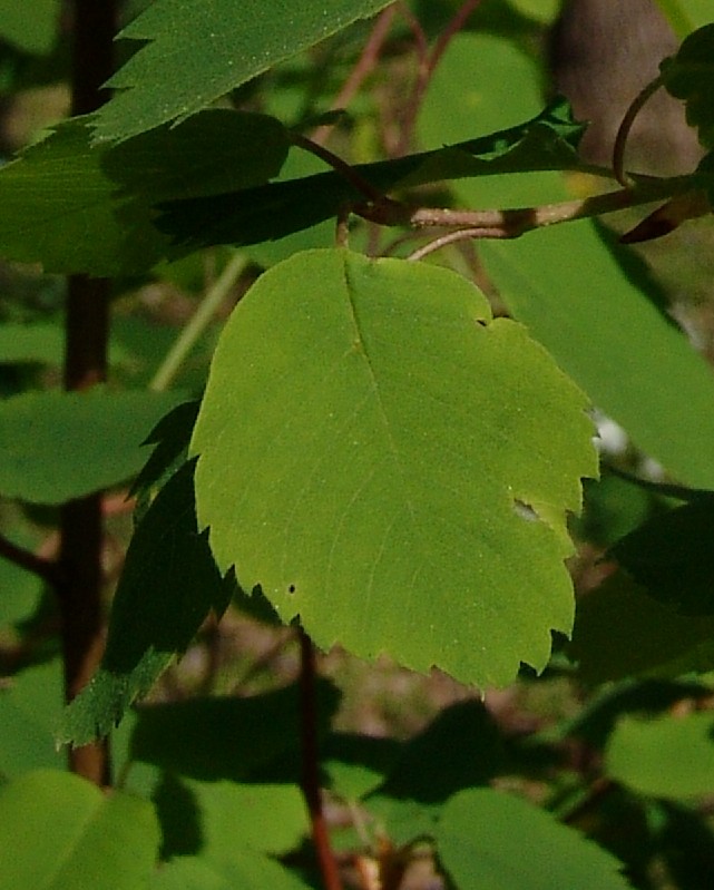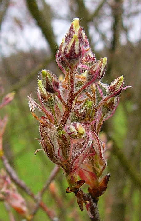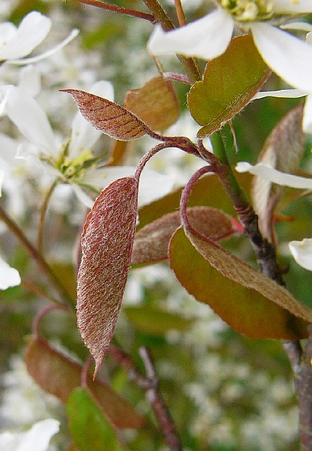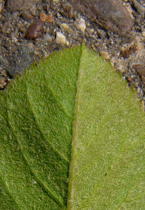 Blätter im Austrieb kupfern, seidenhaarig, mit 1 - 2 mm langer Stachelspitze, eng gesägt
