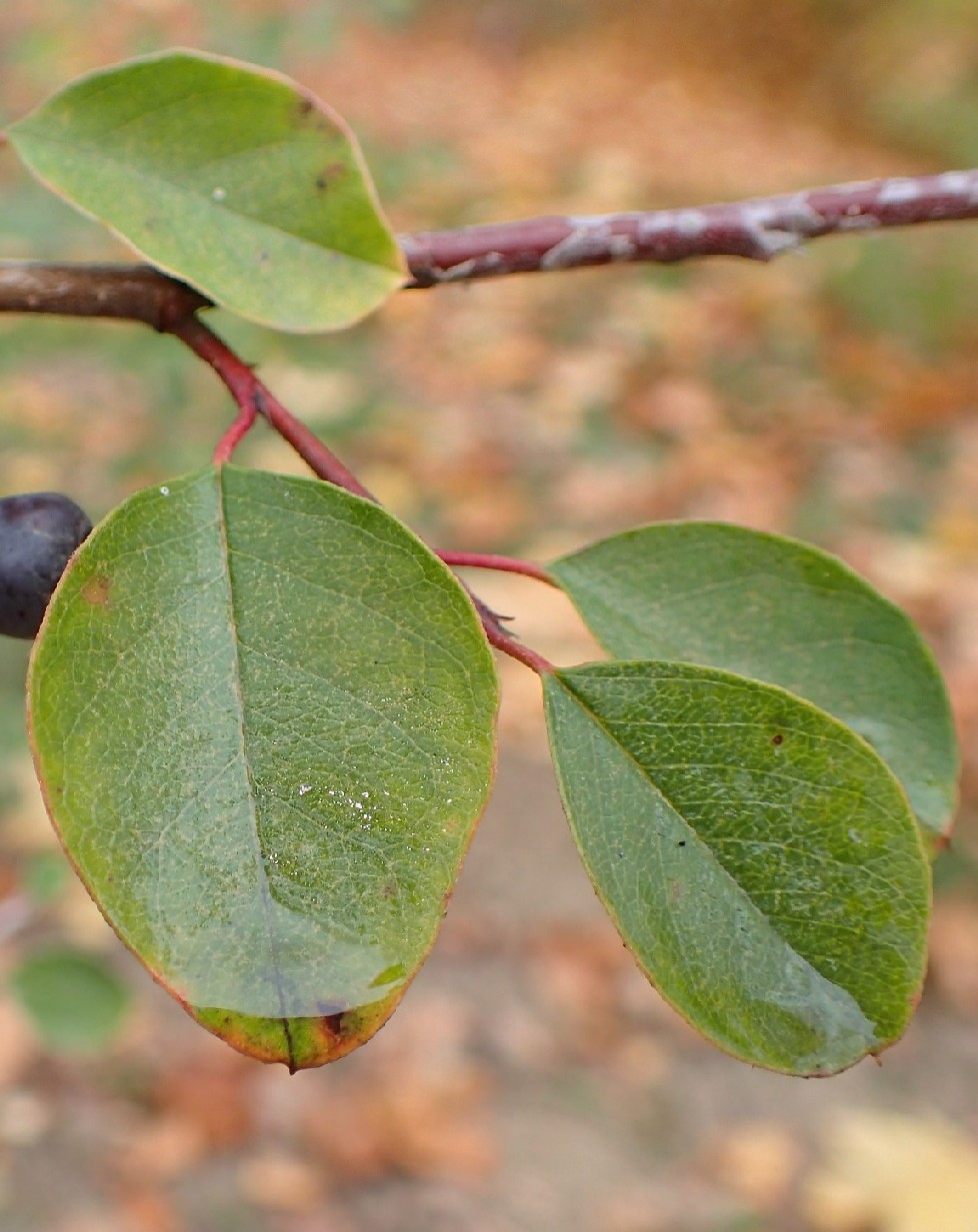 Früchte kugelig, rot, behaart, mit 2 Steinfrüchten Junge Zweige behaart Blätter 18 - 36 mm lang, 13 - 29 mm breit, elliptisch,