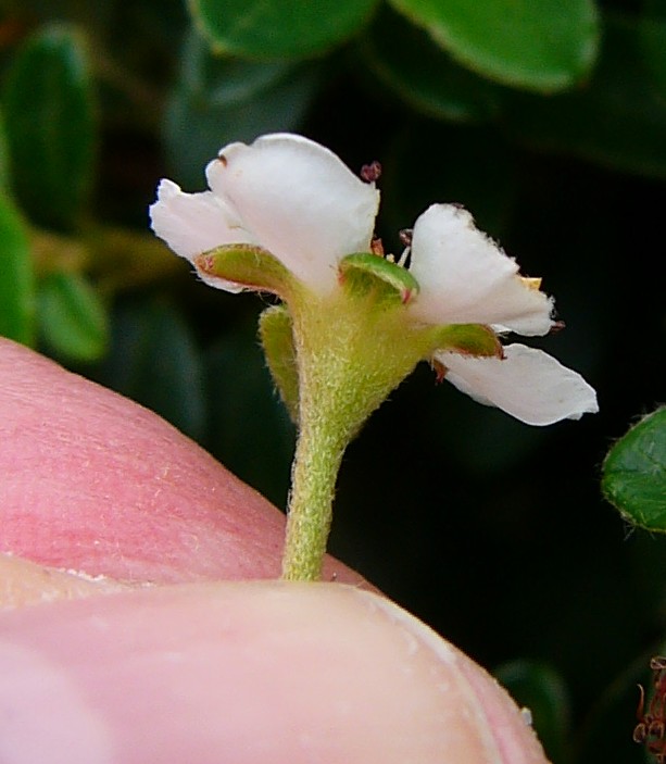 Blüten zu 1 - 4, weiß, 8 mm im Durchmesser, Kronblätter ausgebreitet, 15 - 20 Staubblätter, Antheren purpurn