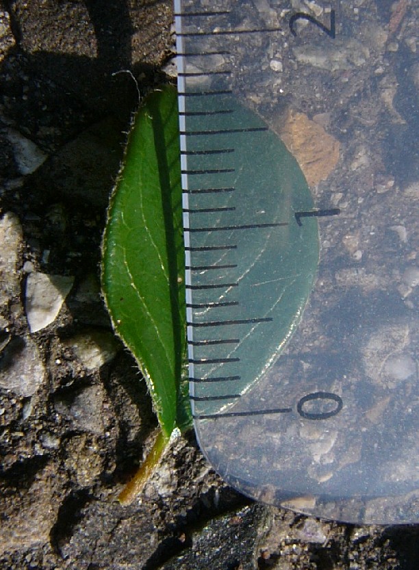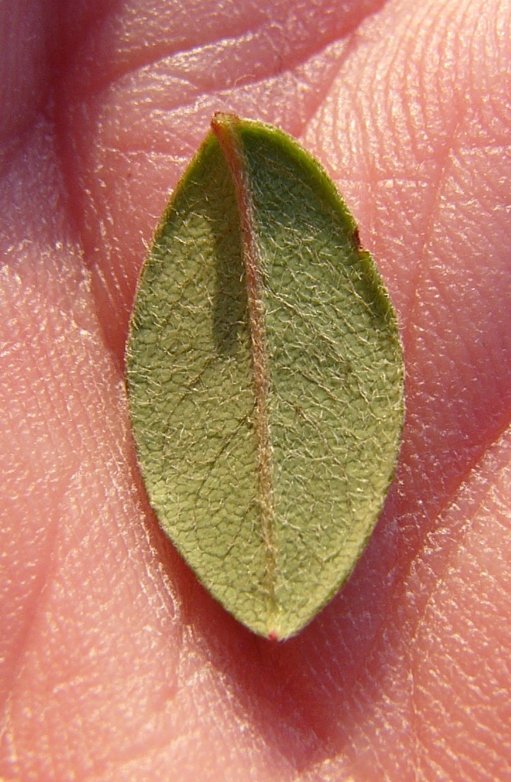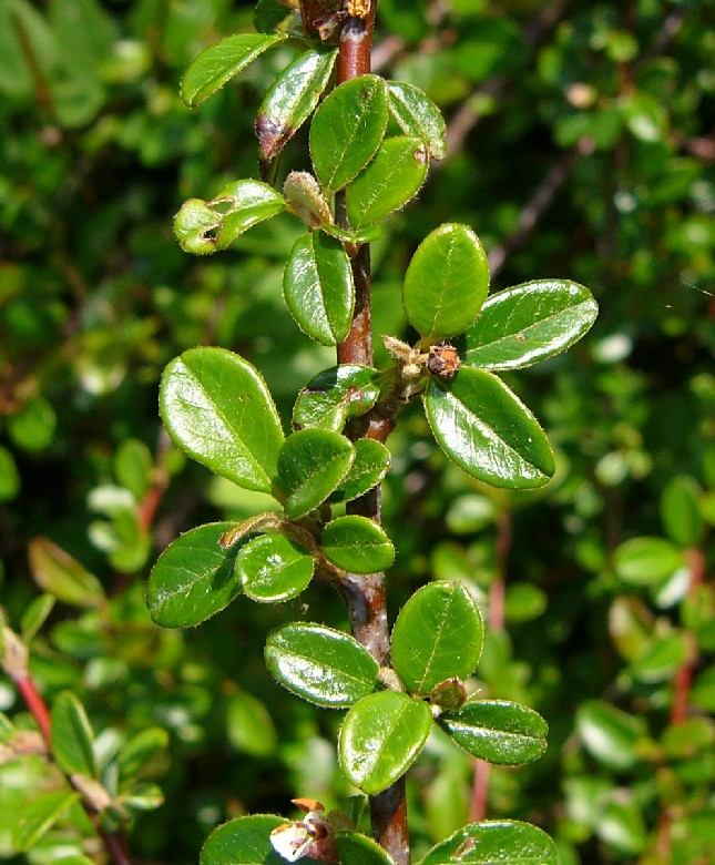 Blätter elliptisch bis eiförmig, 5 - 15 mm lang, stumpf oder ausgerandet, mittelgrün, oberseits glänzend, 1 - 3 mm lang gestielt