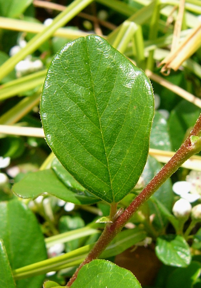 Blätter elliptisch bis eiförmig, spitz oder stumpf, oberseits glänzend, Nerven kaum eingesenkt