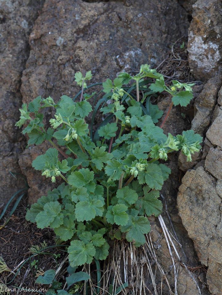 Grundblätter leierförmig, Endblättchen ca. 6 cm im Durchmesser, meist 3-lappig, Blattlappen stumpf, am Grund herzförmig, viel größer als die Seitenblättchen,
