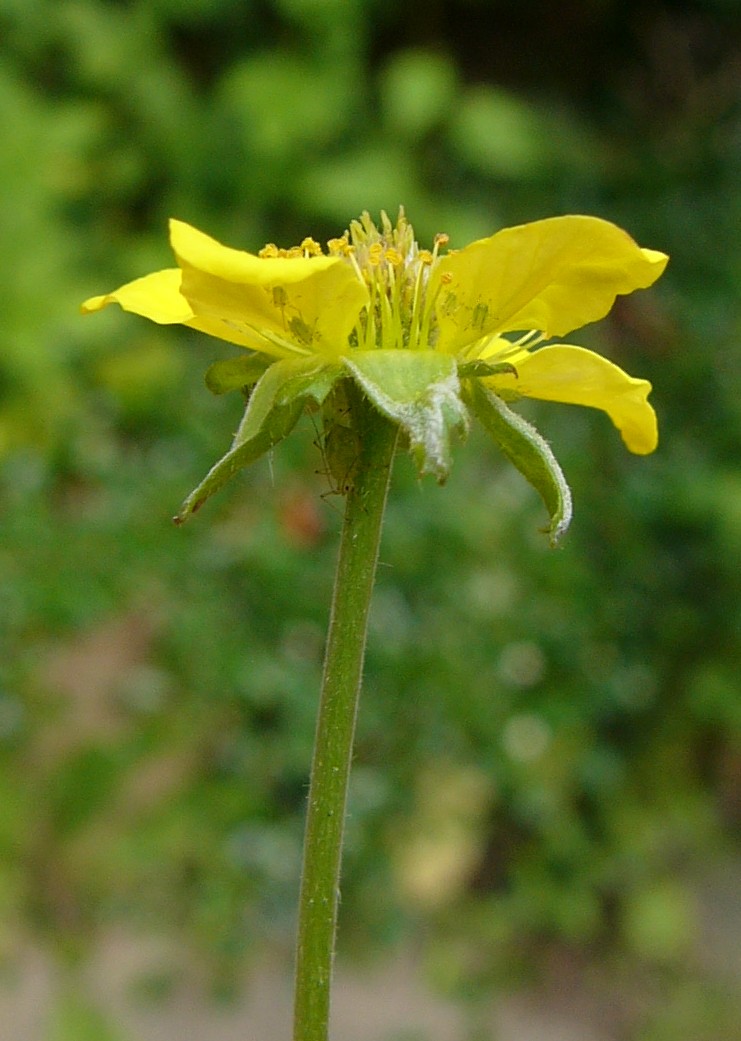 Pflanze 20 - 60 cm groß Blüten aufrecht, 10 - 15 mm im Durchmesser, 5 gelbe Kronblätter Kelch mit schmaleren Außenkelchblättern