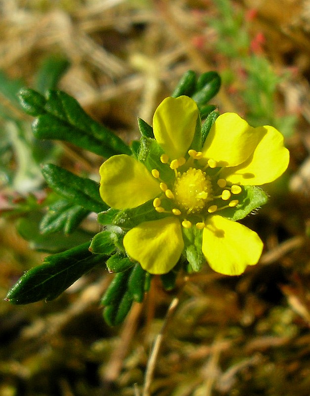 Potentilla - Pflanzen 20 - 80 cm groß, +/- aufrecht, Blüten gelb, 5 Kronblätter, Früchte nicht erdbeerähnlich, Blätter gefingert, meist 5- zählig, Zipfel linealisch, umgerollt, unterseits dicht weißfilzig