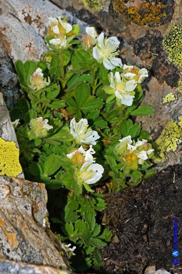 Potentilla - Blüten weiß, Blätter 5- zählig, Blättchen zu Hälfte gezähnt, unterseits mit deutlichen Adern