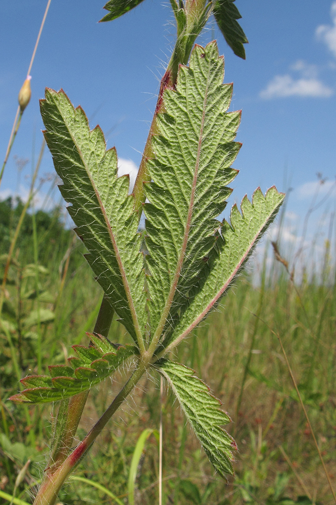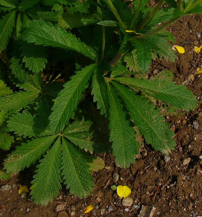 Blätter dunkelgrün, oberseits schwach behaart, mit 5 - 7 Blättchen (die beiden äußeren oft sehr klein), Fiederblättchen im vorderen Drittel am breitesten, stumpf gezähnt
