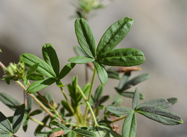 Blätter handförmig 3- oder 5- zählig, lederig, an den Seiten ganzrandig und umgerollt, nur vorne mit 3 ungleichen Zähnen, oberseits grün, kahl
