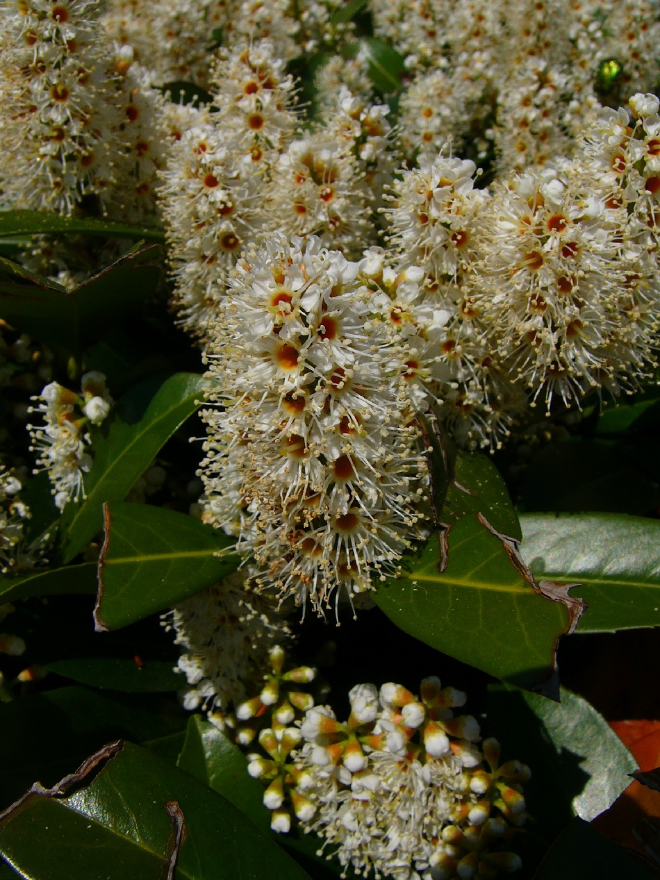 Prunus - Blüten in vielblütigen Trauben, Blätter immergrün, ledrig