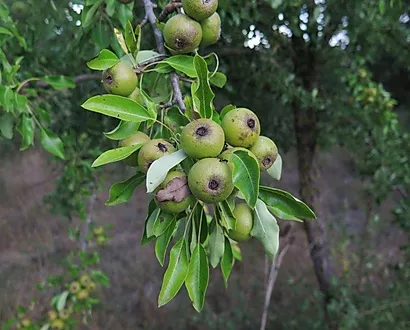 birnenförmig, Kelchblätter bleibend, Zweige anfangs dicht filzig behaart, später schwärzlich, mit Dornen d.h. die spindelförmigen Knospen an den Kurztrieben haben im Gegensatz zur Kulturbirne scharfe Spitzen