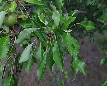 Rinde grau bis braunviolett, Zweige kahl, mit vielen Lentizellen und einigen Dornen d.h. die spindelförmigen Knospen an den Kurztrieben haben im Gegensatz zur Kulturbirne scharfe Spitzen Blätter linealisch- lanzettlich, 3 - 6 cm lang,