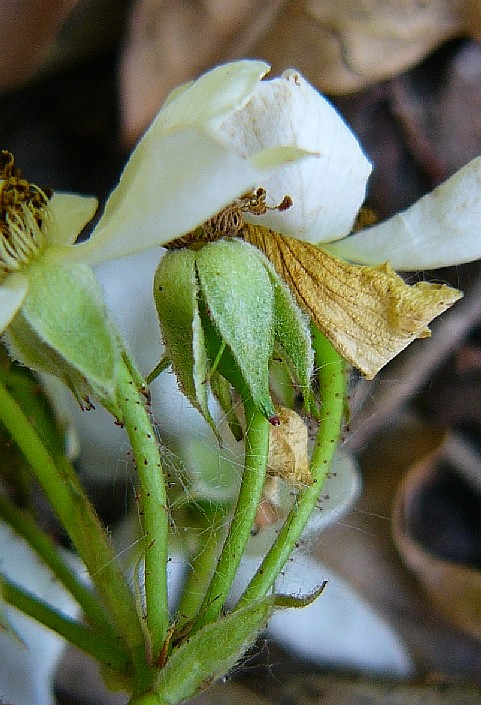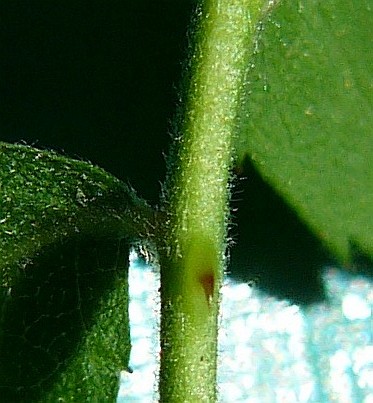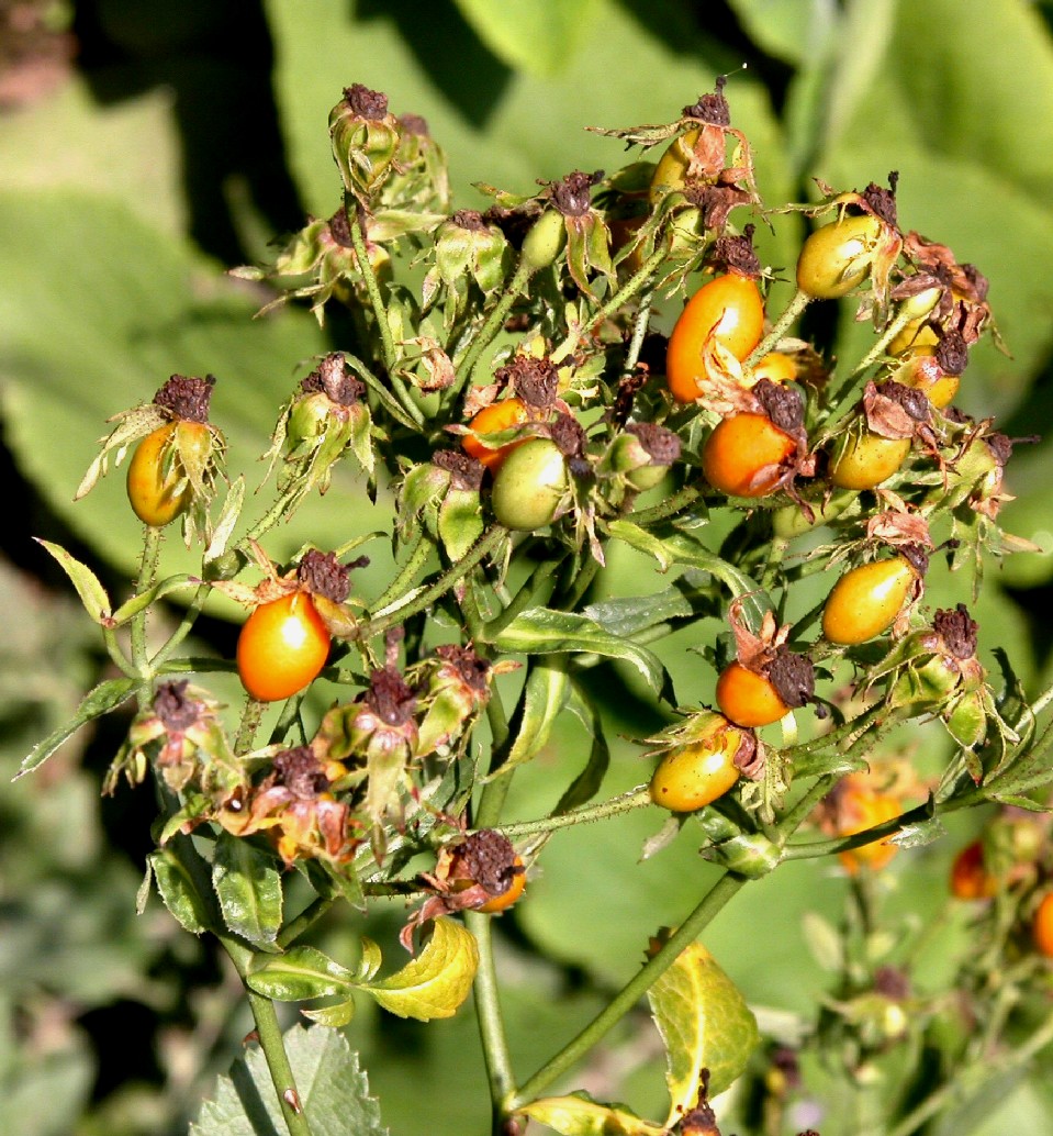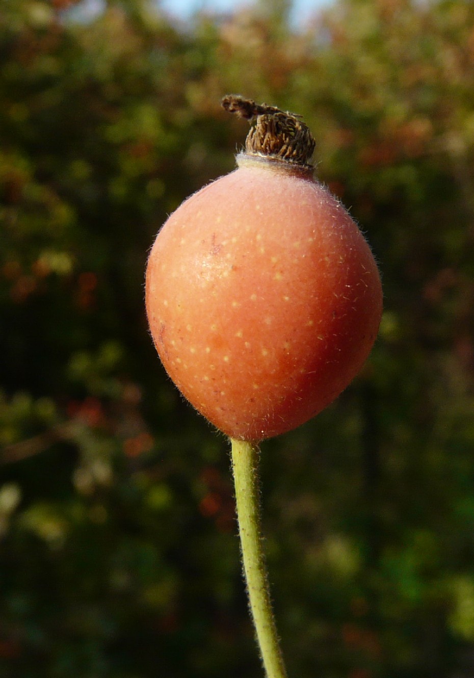 schwach behaart, drüsig, mit Seitenfiedern, Reife Hagebutten 10 mm lang, eiförmig,