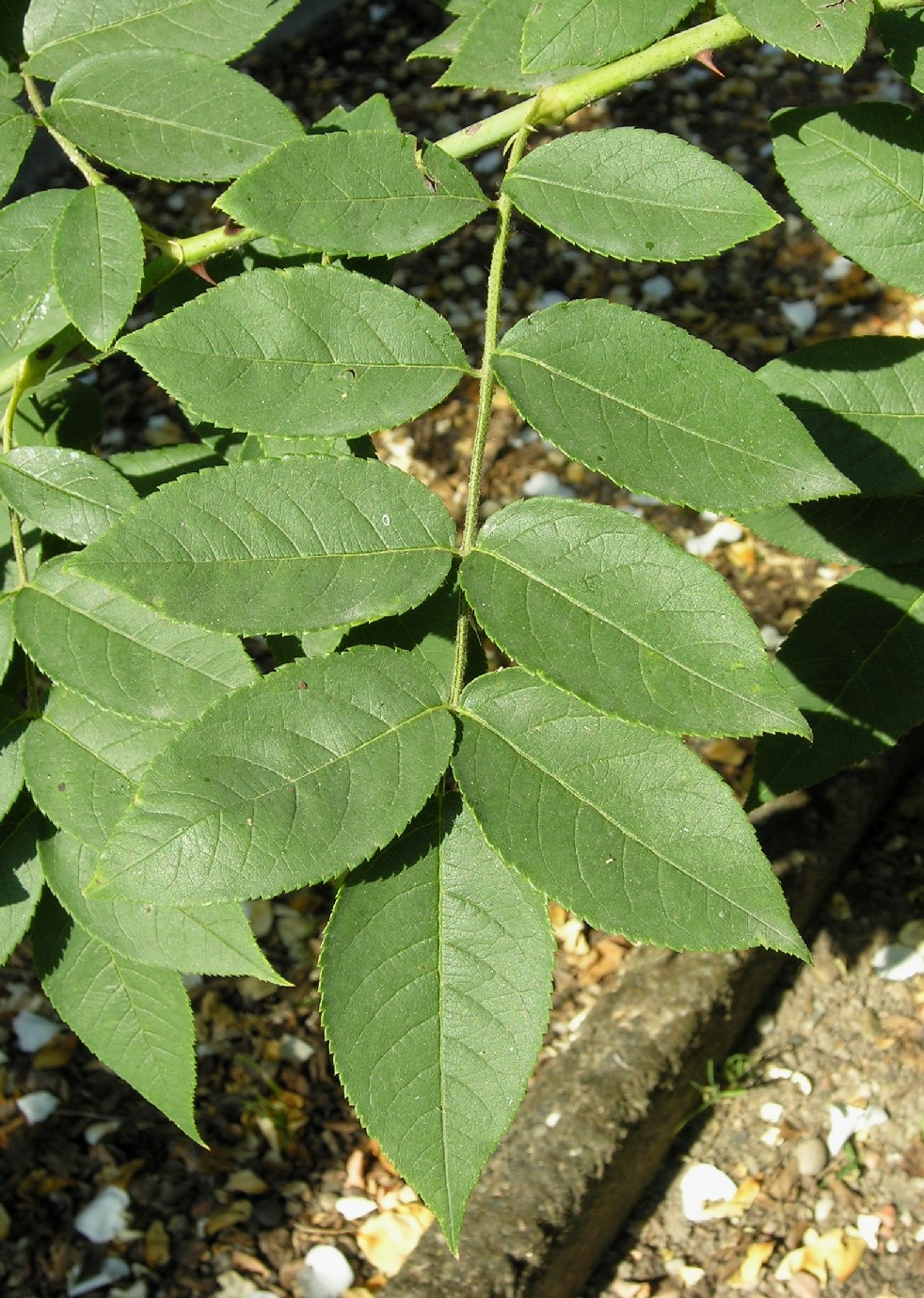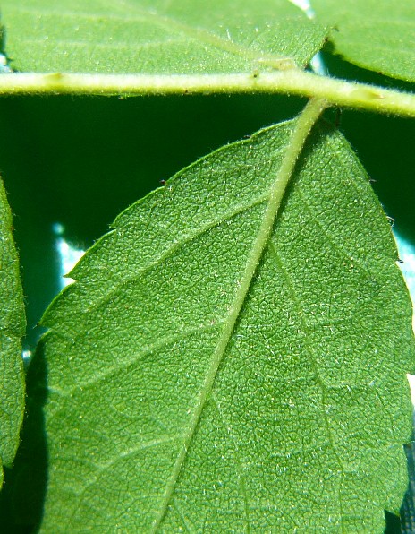 Blätter 10 - 15 cm lang, mit 5 - 9 Fiederpaaren, Fiederblättchen 3 - 5 cm lang, 2 - 3 cm breit, spitz, einfach gesägt, oberseits kahl, unterseits auf den Nerven behaart