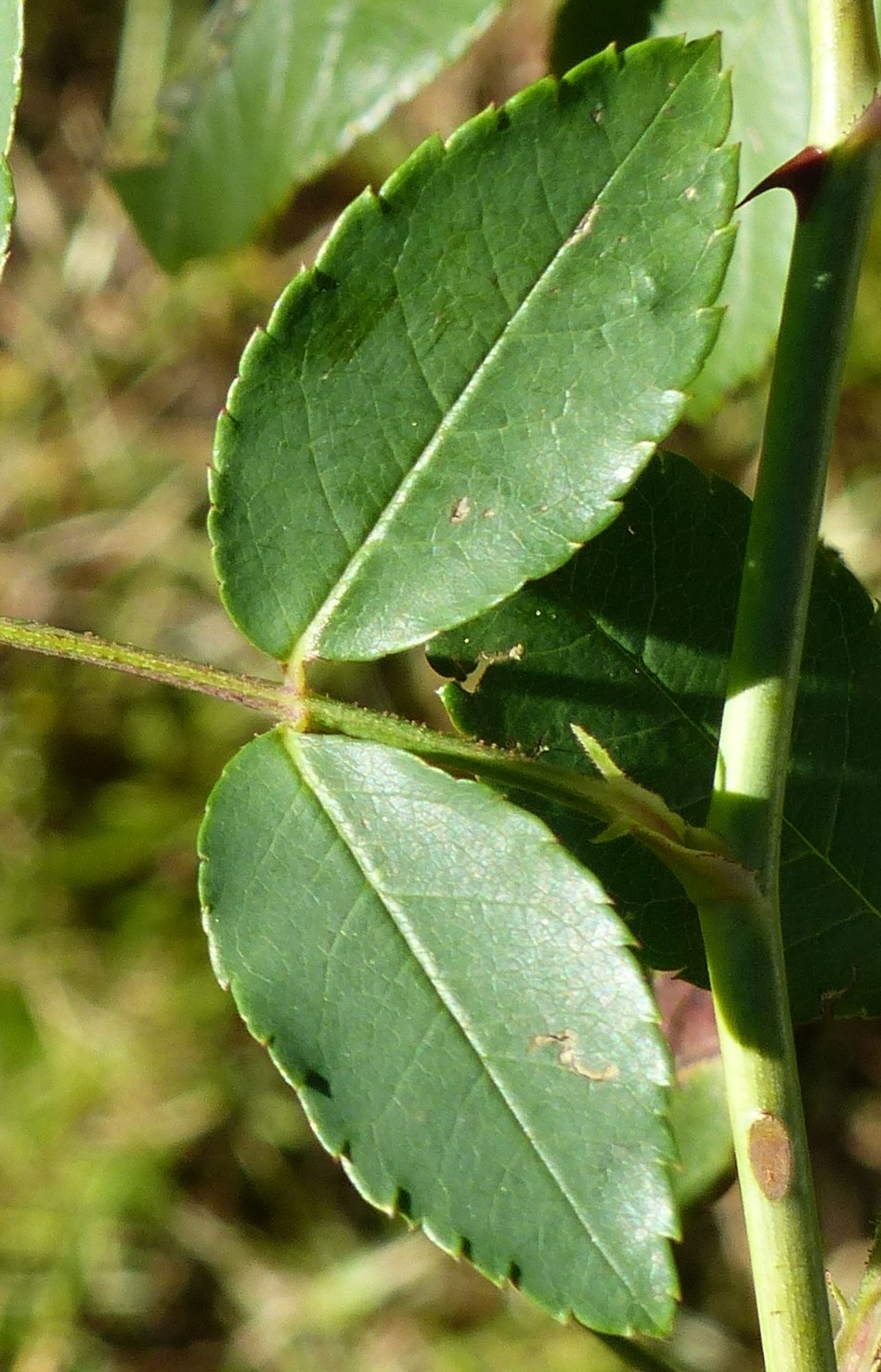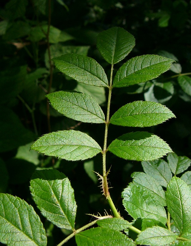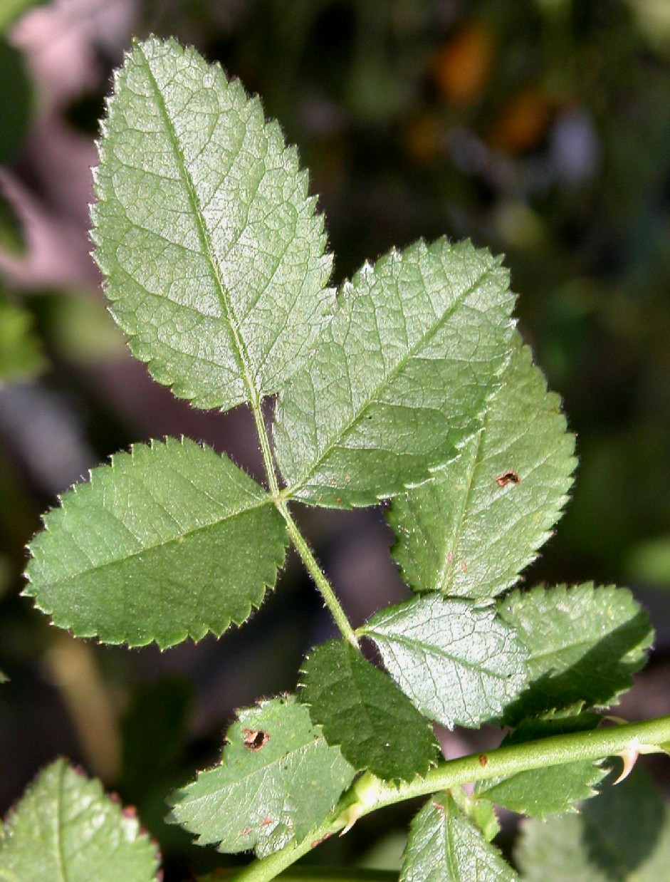 Blätter 10 - 15 cm lang, meist mit 5 Fiederpaaren, Fiederblättchen oval, 20 - 45 mm lang, 15 - 27 mm breit, +/- stumpf, am Grund gestutzt, einfach oder doppelt gesägt, oberseits schwach behaart, unterseits graugrün, behaart, Rhachis behaart mit Stacheln, Nebenblätter drüsig, nicht zerschlitzt, am Grund geöhrt