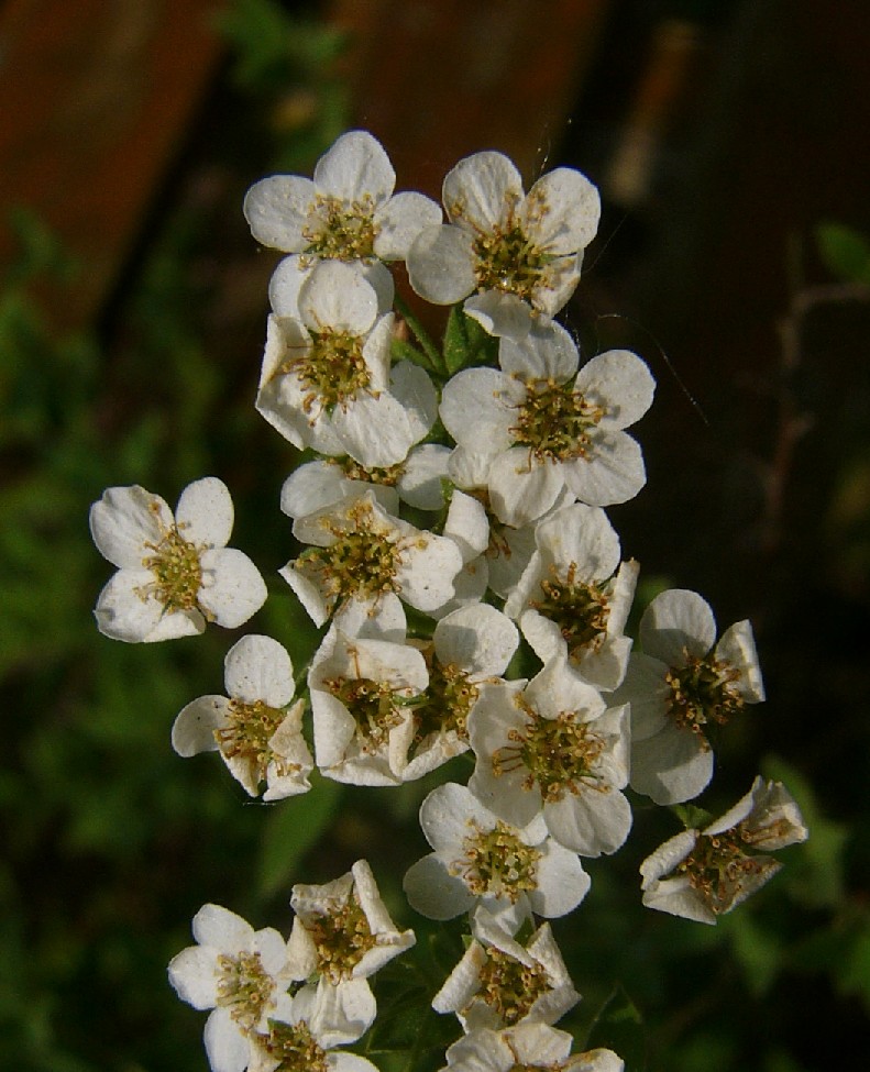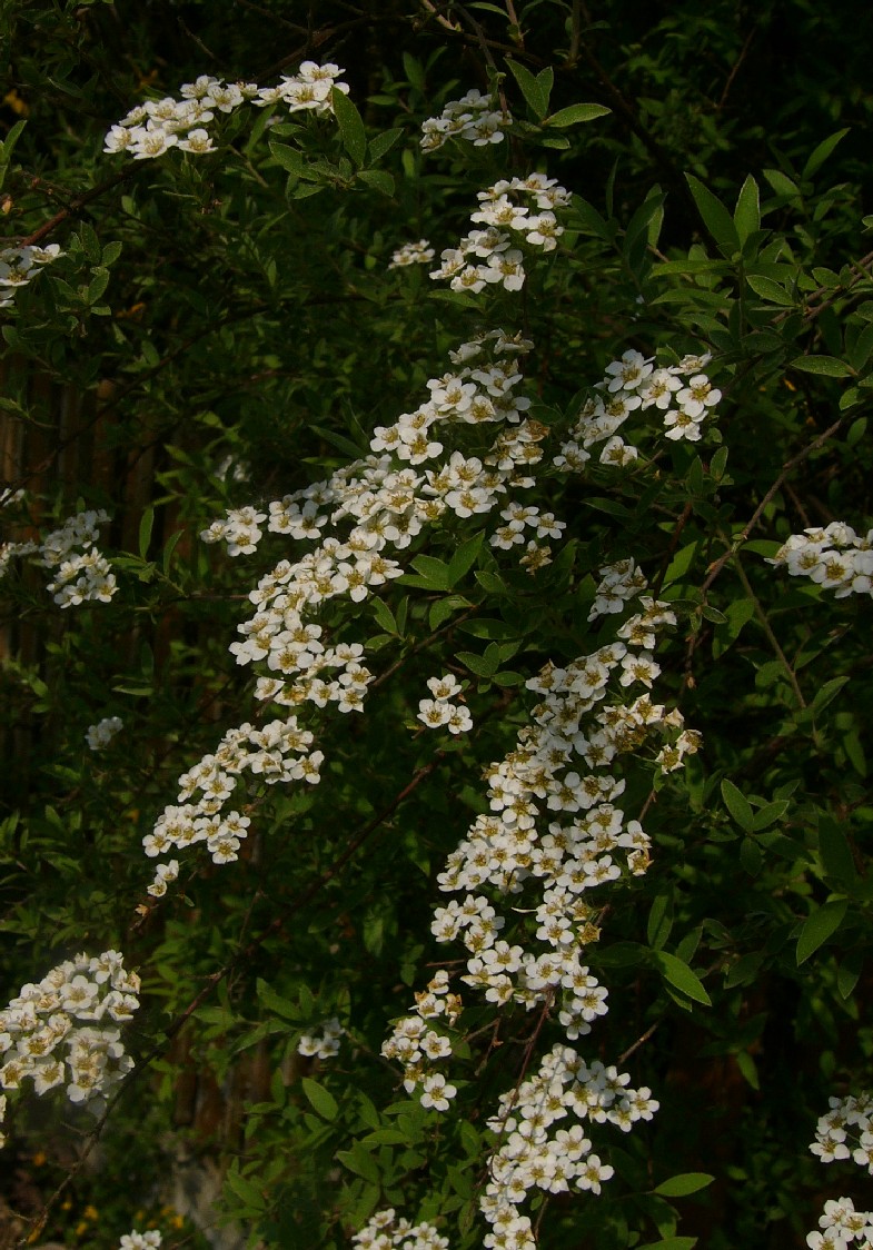 An einem Ast finden sich doldige (wie bei Spiraea hypericifolia) und trugdoldige (wie bei Spireaea cana) Blütenstände, Blütenstände seitlich entlang der vorjährigen Zweige