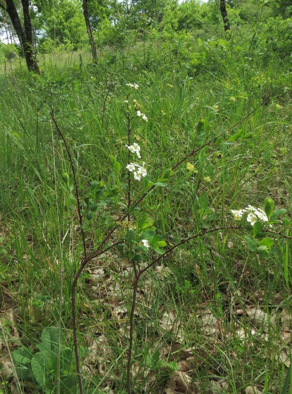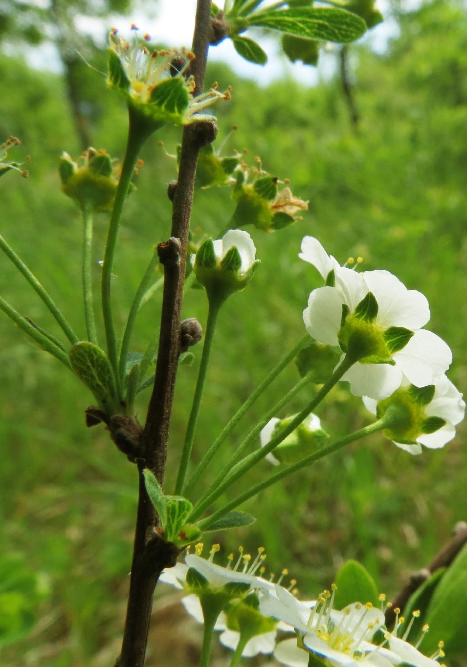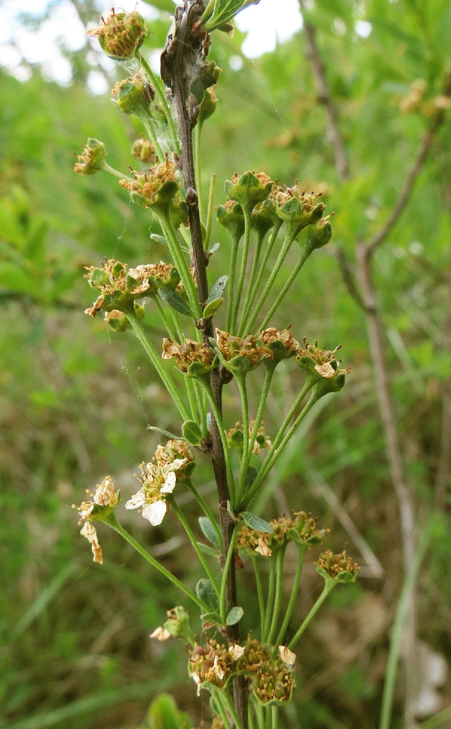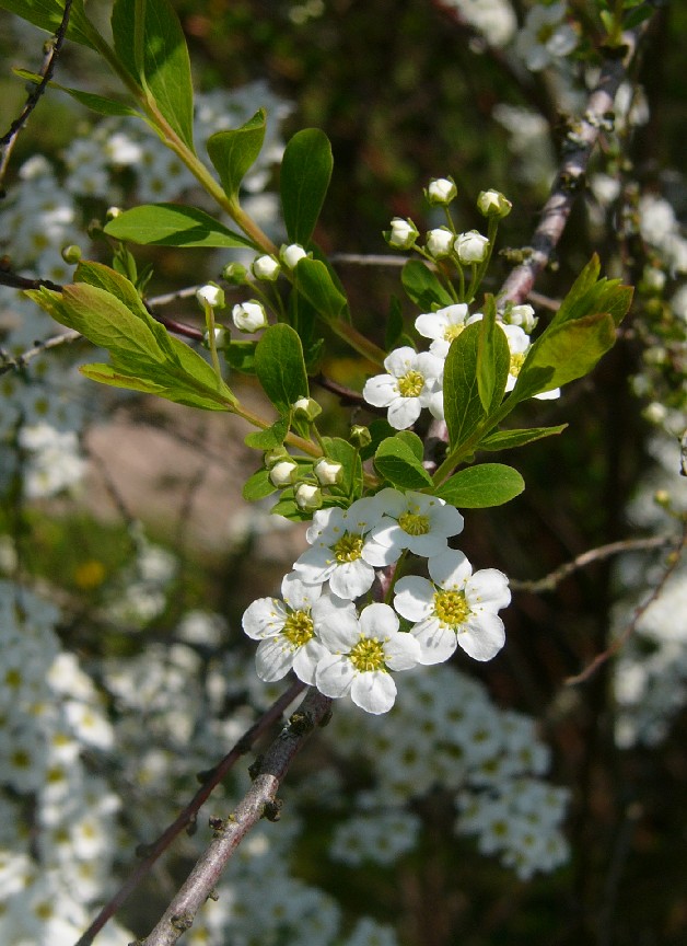 An einem Ast finden sich doldige (wie bei Spiraea hypericifolia) und trugdoldige (wie bei Spireaea cana) Blütenstände, Blütenstände seitlich entlang der vorjährigen Zweige