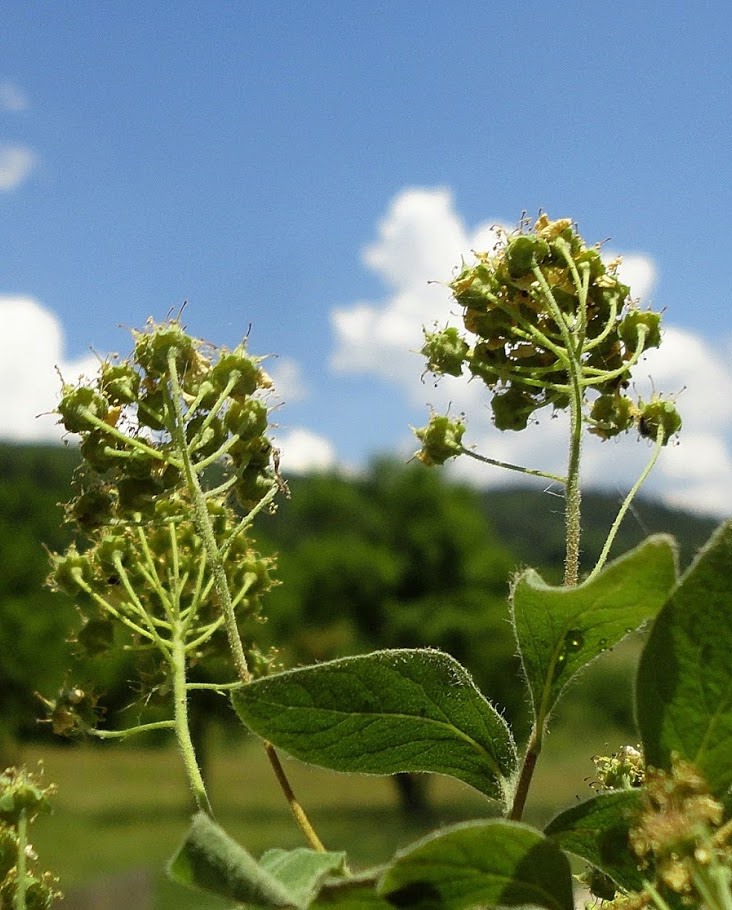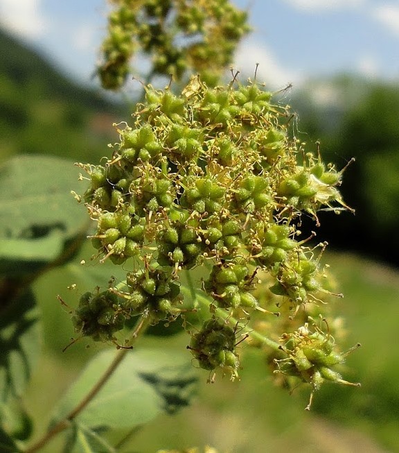 Blütenstände ca. 2 cm im Durchmesser, halbkugelig, trugdoldig,