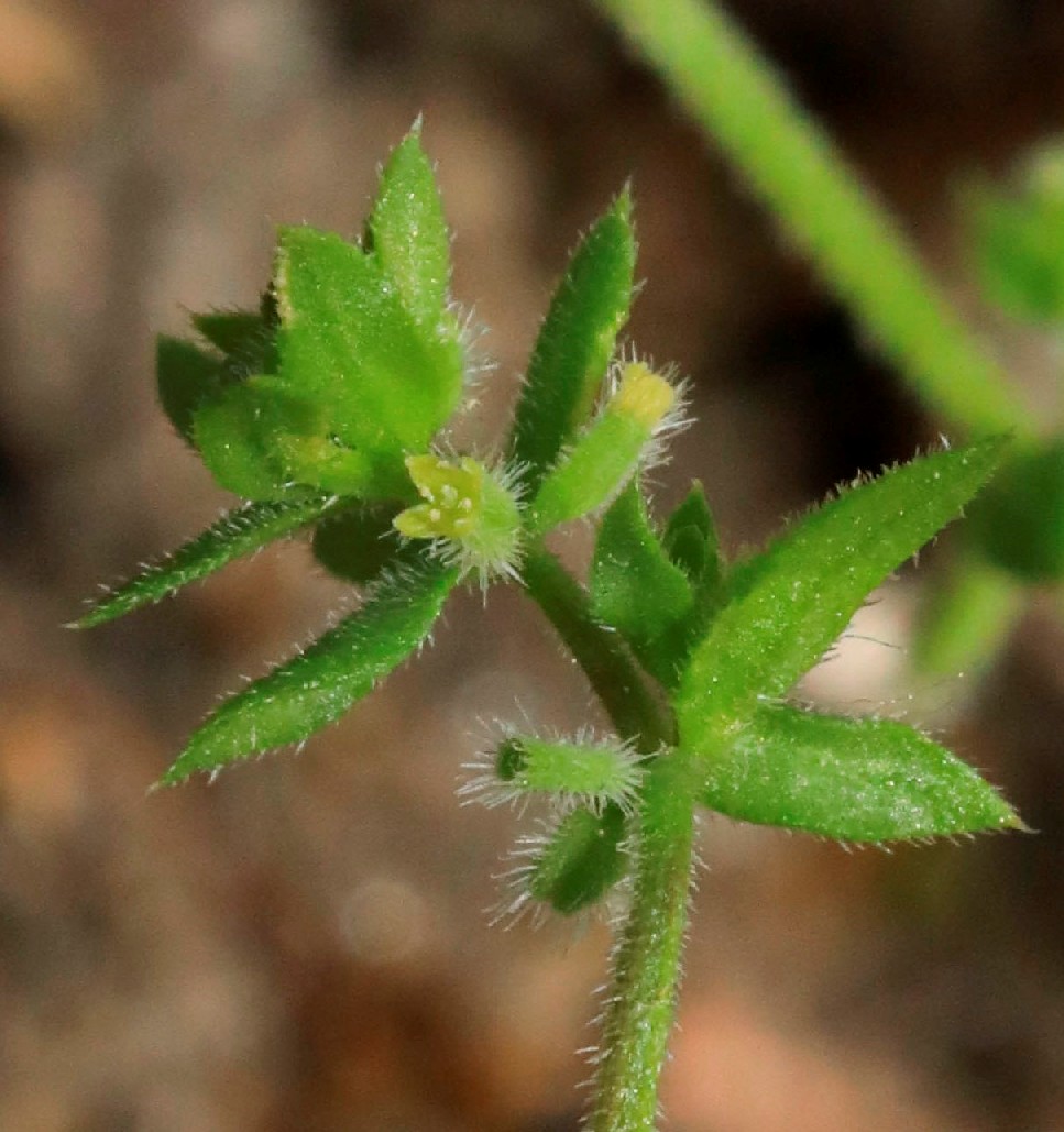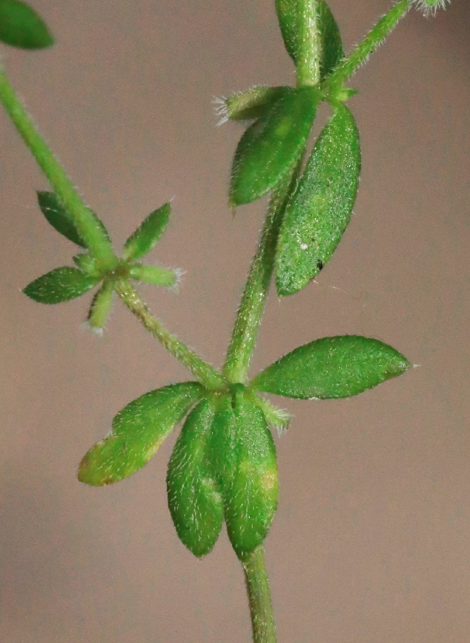 Fruchtstiel länger als der Blütenstandsstiel Stängel borstig behaart, Blätter zu 4 - 6 im Quirl, im Blütenstand zu 2 - 3