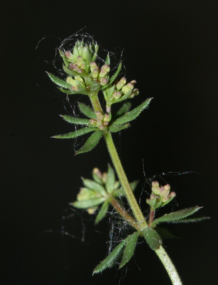 Stängel vierkantig, schlank,im oberen Teil fast glatt, im unteren Teil weniger dicht mit Stacheln besetzt als Galium parisiene