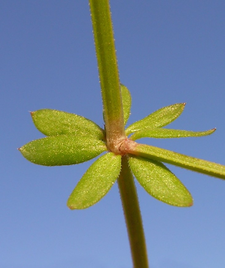 Blätter schmal lanzettlich, 3 - 12 mm lang, zu 6 - 8 im Quirl, mit Stachelspitze, am Rand durch vorwärts gerichtete Stacheln rau