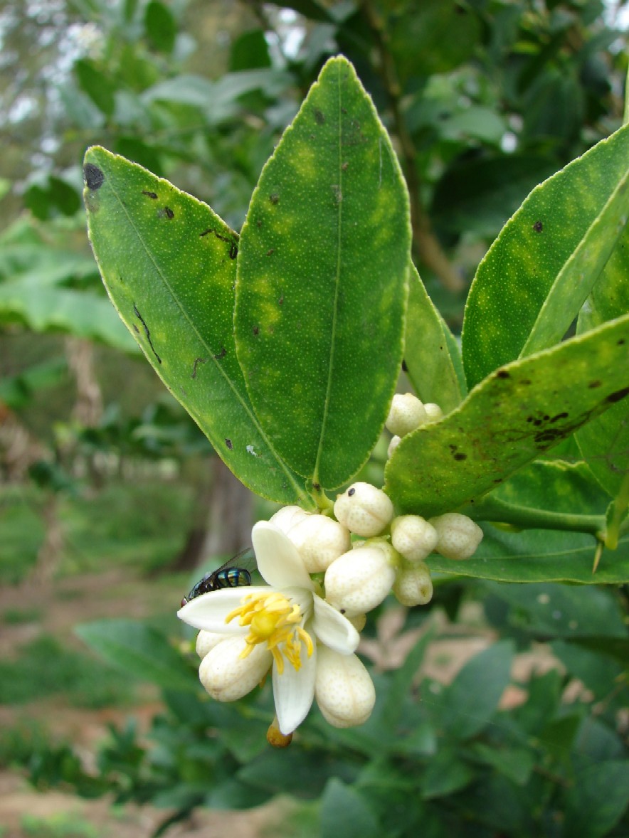 Reife Frucht etwa so groß wie ein Tischtennisball, meist grün im Handel, reif gelb, süß oder sauer, mit zitzenförmigem Ende Junge Zweige mit dünnen Dornen besetzt, Blattstiel kaum geflügelt