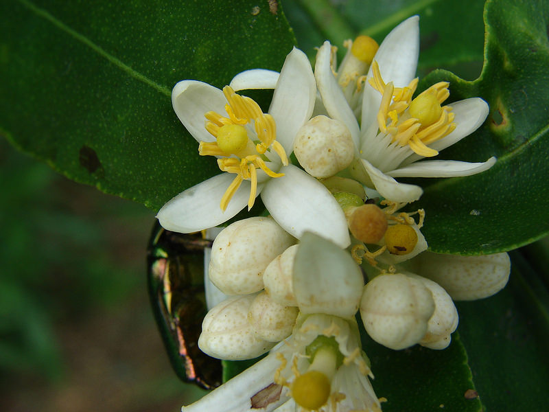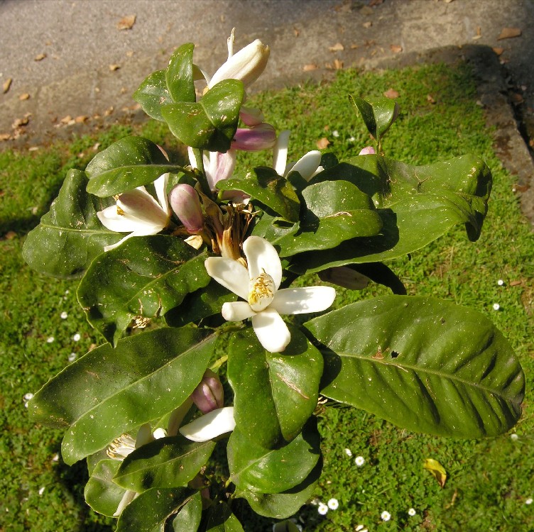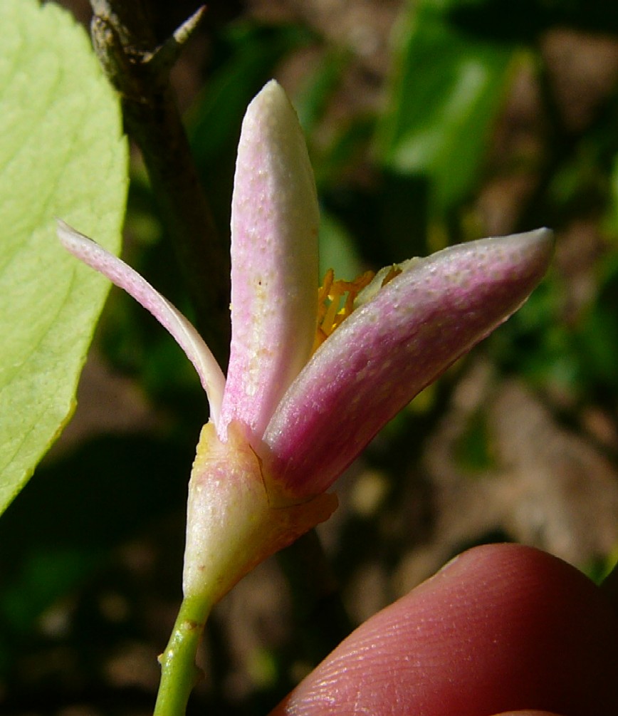 Blüten innen weiß, außen rötlich, 2 - 3 cm im Durchmesser, duftend, mit 20 - 40 Staubblättern, die mit den Staubfäden zu mehreren Gruppen verwachsen sind