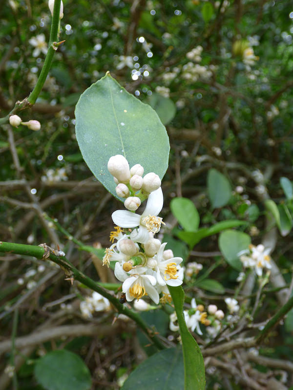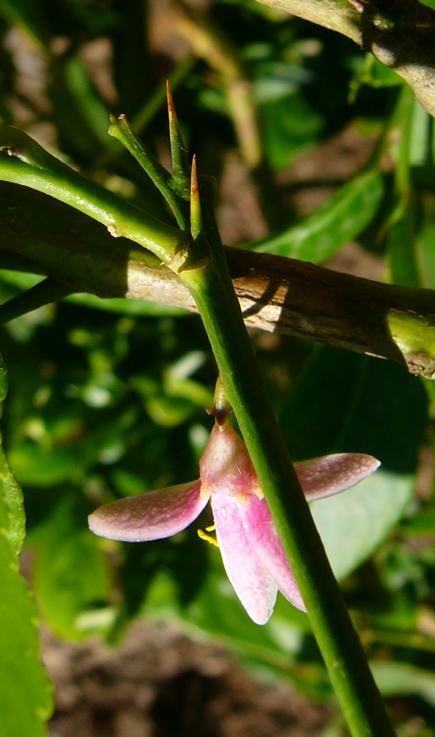 Junge Zweige mit dünnen Dornen besetzt, Blattstiel kaum geflügelt
