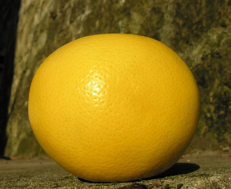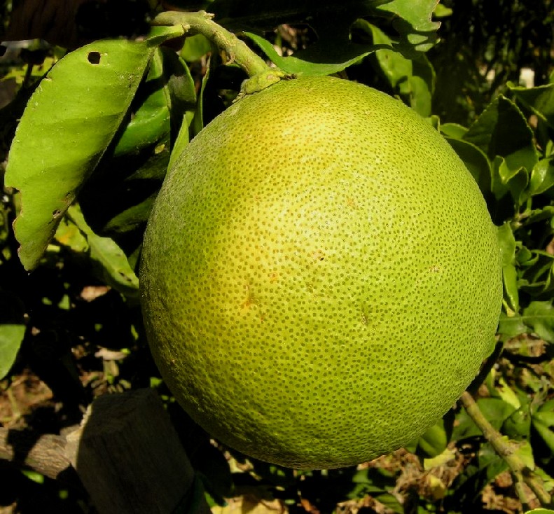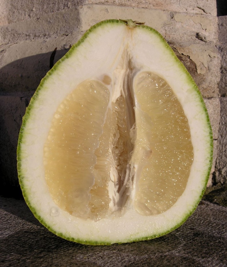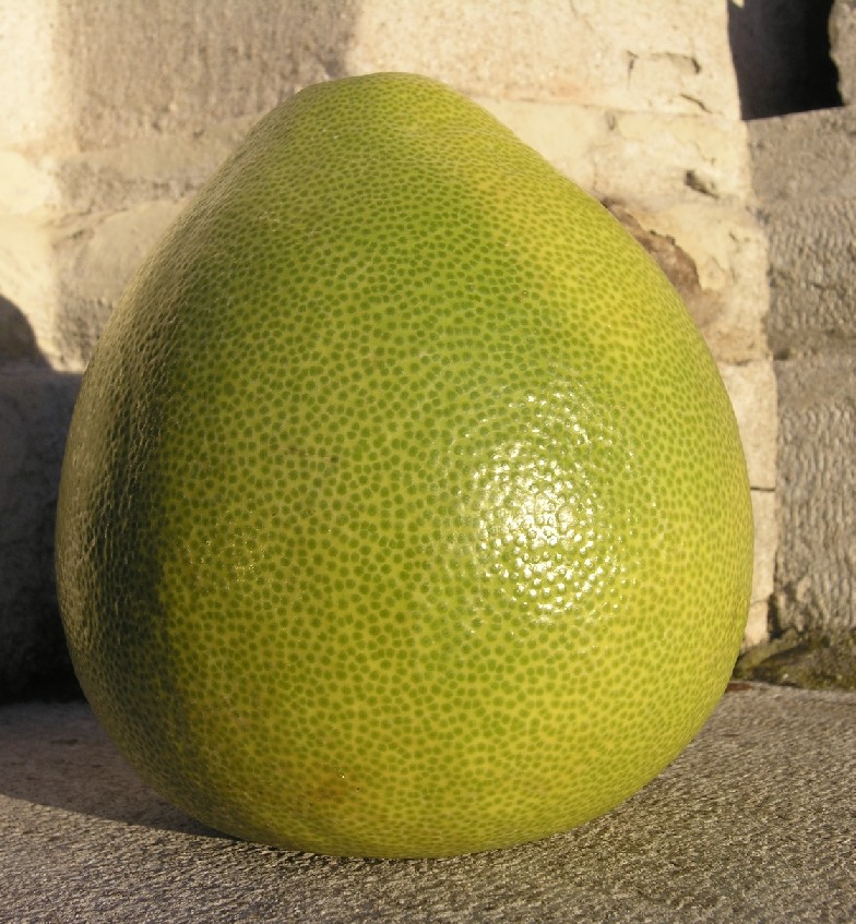 V- IX, Ziergehölz Rückkreuzung von Orange (Citrus x sinensis) und Pampelmuse (Citrus maxima) Synonyme: English name: Die Pomelo ist durch eine nochmalige Einkreuzung von Citrus maxima zu Citrus x paradisi entstanden. Sie ähnelt einer Grapefruit sehr stark, das Fruchtfleisch ist jedoch süßer.