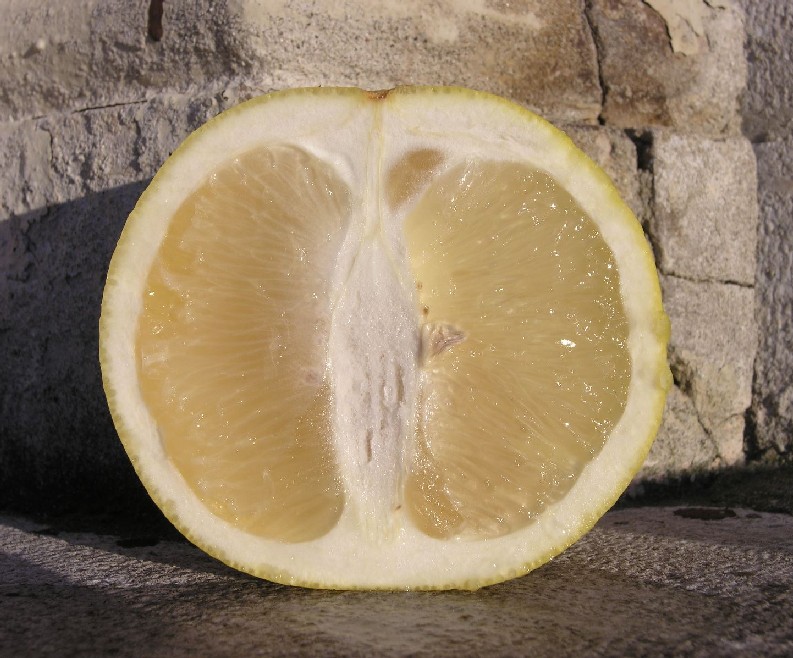 Frucht rundlich, 10 - 15 cm im Durchmesser, Fruchtschale gelb