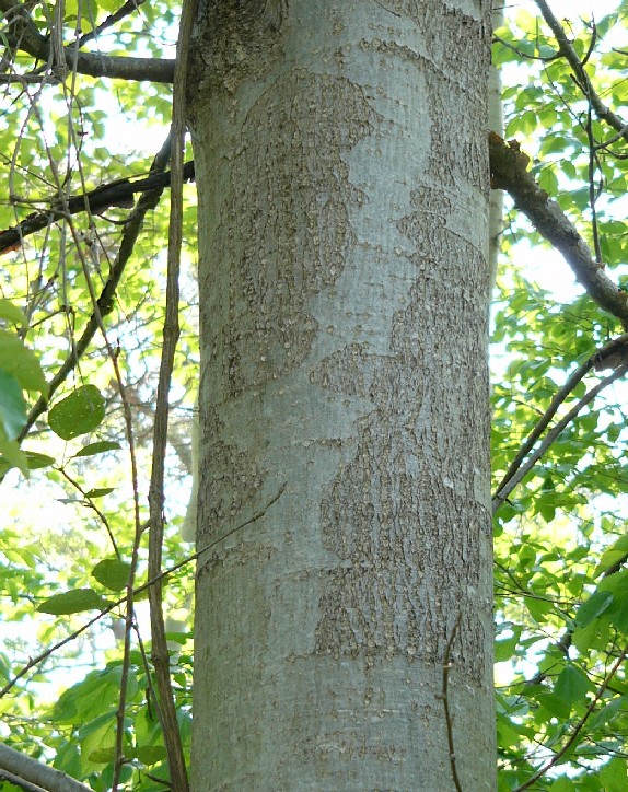 Borke grau, glatt, bei älteren Bäumen rautenförmig oder längs schwarz aufreißend