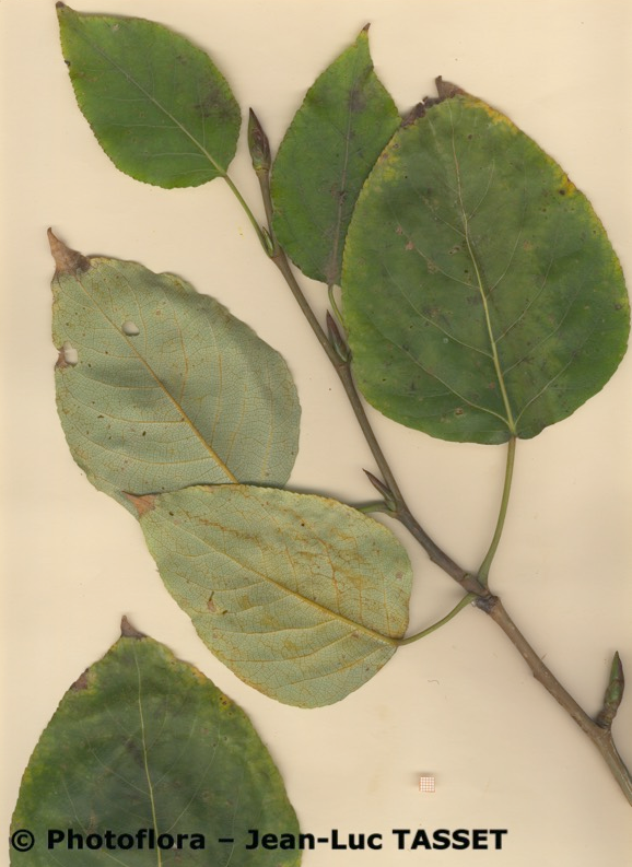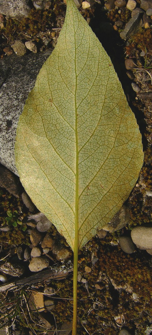 Blätter eiförmig, 7 - 10 cm lang, lang zugespitzt, Blattgrund keilförmig, Rand kerbig gesägt bis fast ganzrandig, oberseits dunkelgrün, kahl