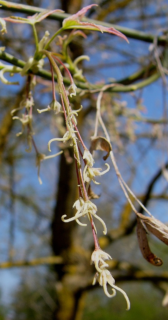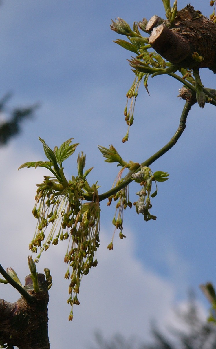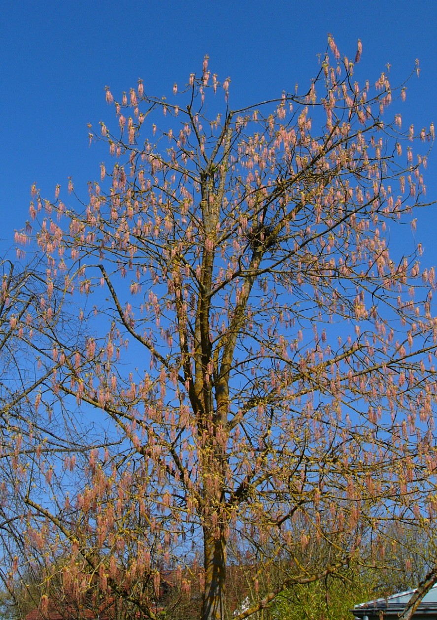 Pflanze zweihäusig getrenntgeschlechtlich, Blüten vor oder mit den den Blättern erscheinend, in hängenden Blütenständen Männliche Blüten mit 4 - 6 Staubblättern