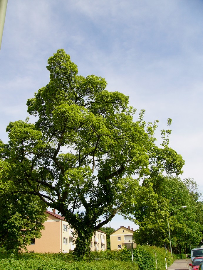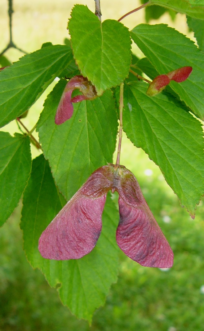 3 - 5 m hoher Strauch oder Baum Blüten grünlich- weiß Fruchtflügel fast parallel, anfangs behaart Blätter 6 - 10 cm lang, meist ungelappt, 2 - 3 cm lang gestielt oder mit 2 kleinen, +/- stumpfen Seitenlappen, Mittellappen breit Herbstlaub gelb bis orange