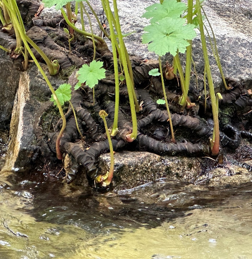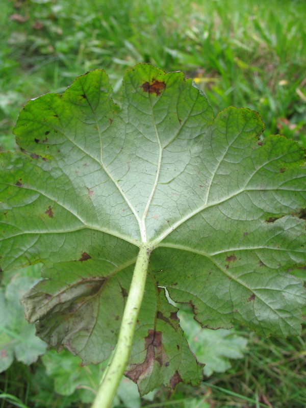 Blattstiel bis 1 m lang, in der Mitte des Blattes ansetzend, Aderung deutlich