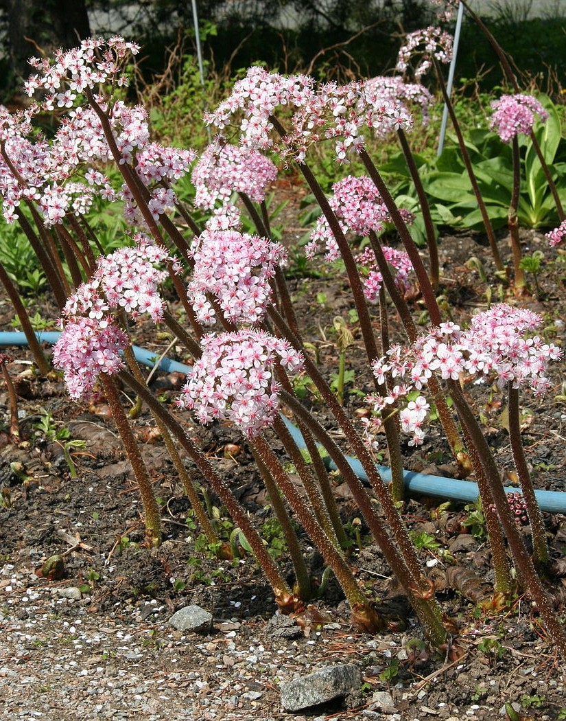 Blüten weiß oder rosa, in vielblütigen Rispen oder