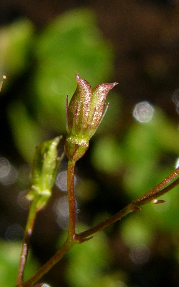 Die beiden Fruchtblätter sind im unteren Teil verwachsen, mit freien und auseinander weisenden Enden bzw. Griffeln, Kelchblätter lanzettlich, bei fruchtenden Pflanzen nach unten geschlagen, Reste der Staubblätter oft haftend