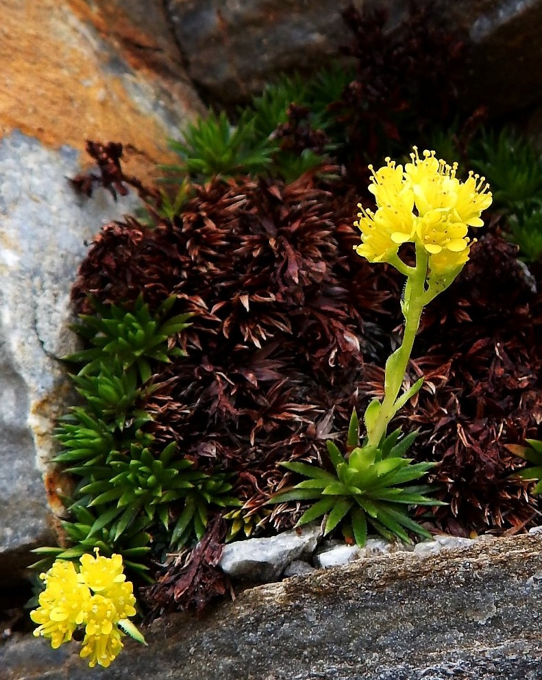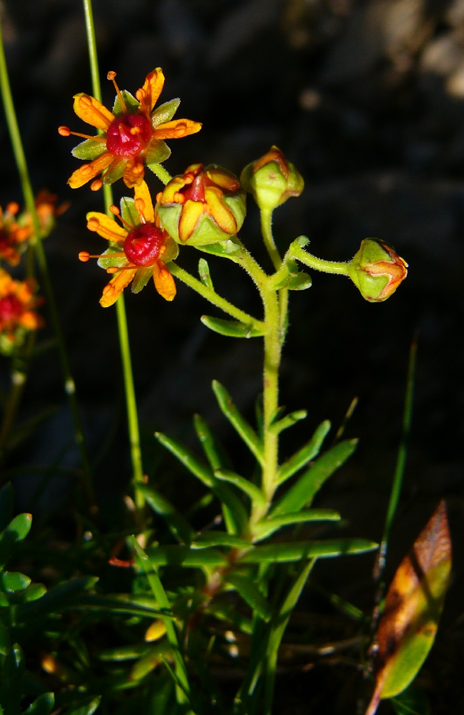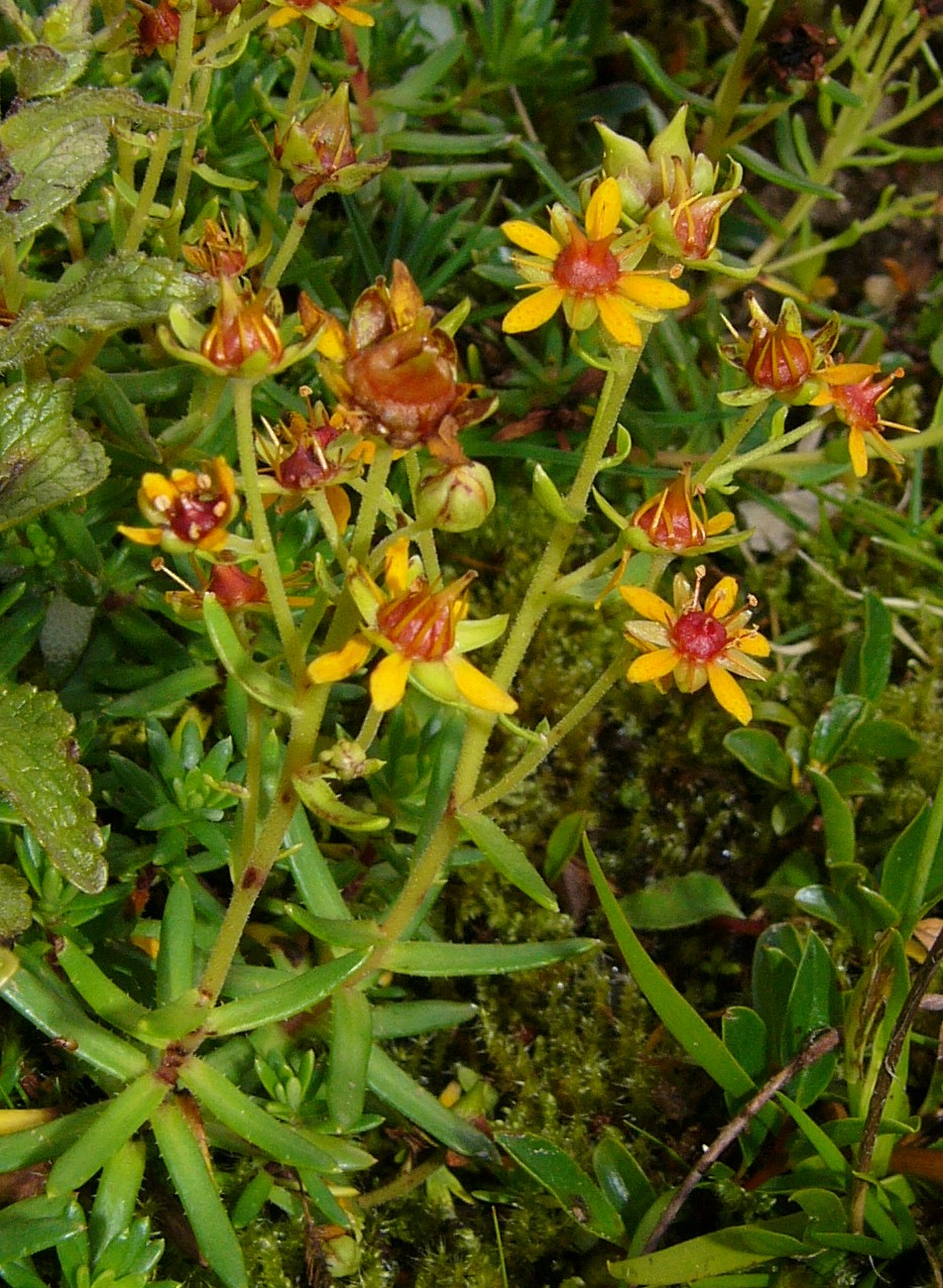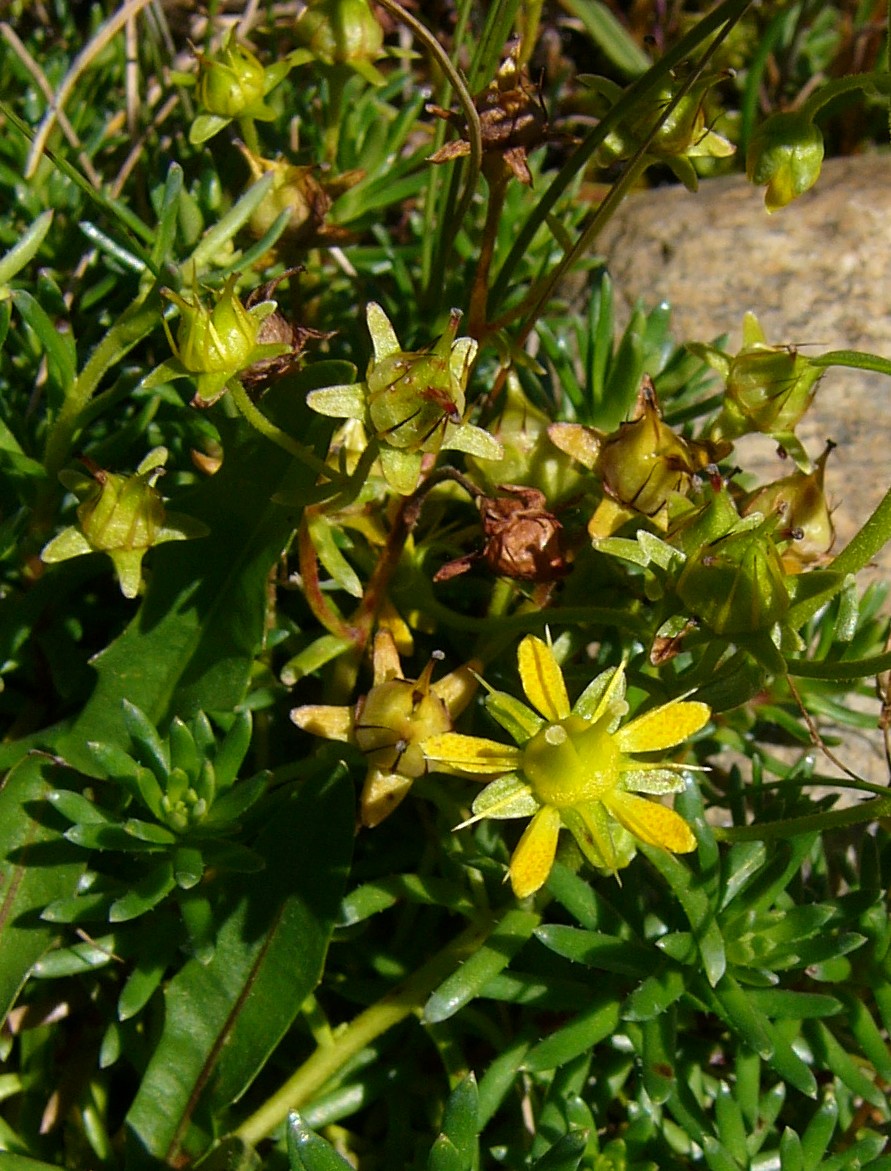 Steinbrech - Blüten zu 2 - 10, dottergelb oder orange, lockere Polster bildend, Blätter linealisch, stachelspitzig
