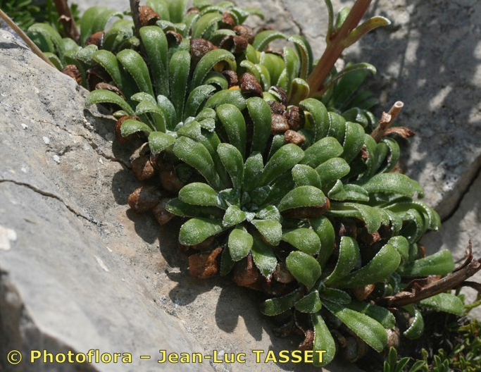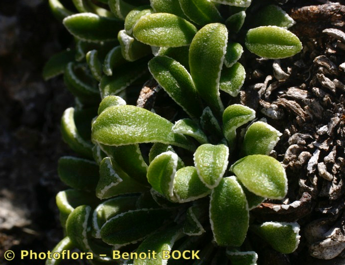 Grundblätter löffelförmig, 10 - 30 mm lang, vorne +/- abrupt in eine rundliche, stumpfe Spitze erweitert, mit Kalk ausscheidenden Grübchen am Rand