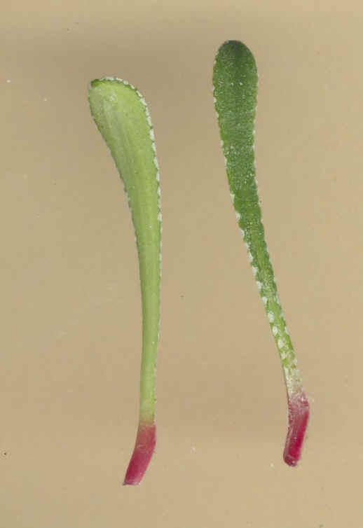 3 Grundblätter löffelförmig, 10 - 30 mm lang, vorne +/- abrupt in eine rundliche, stumpfe Spitze erweitert