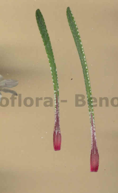 Grundblätter linealisch, 30 - 100 mm lang, 3 - 6 mm breit, ledrig, spitzenwärts nicht verbreitert, ganzrandig, mit Kalk ausscheidenden Grübchen am Rand