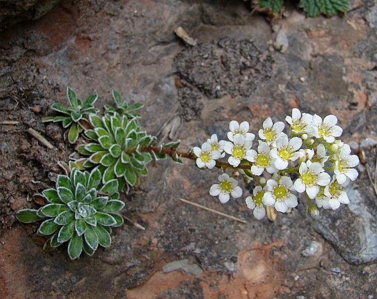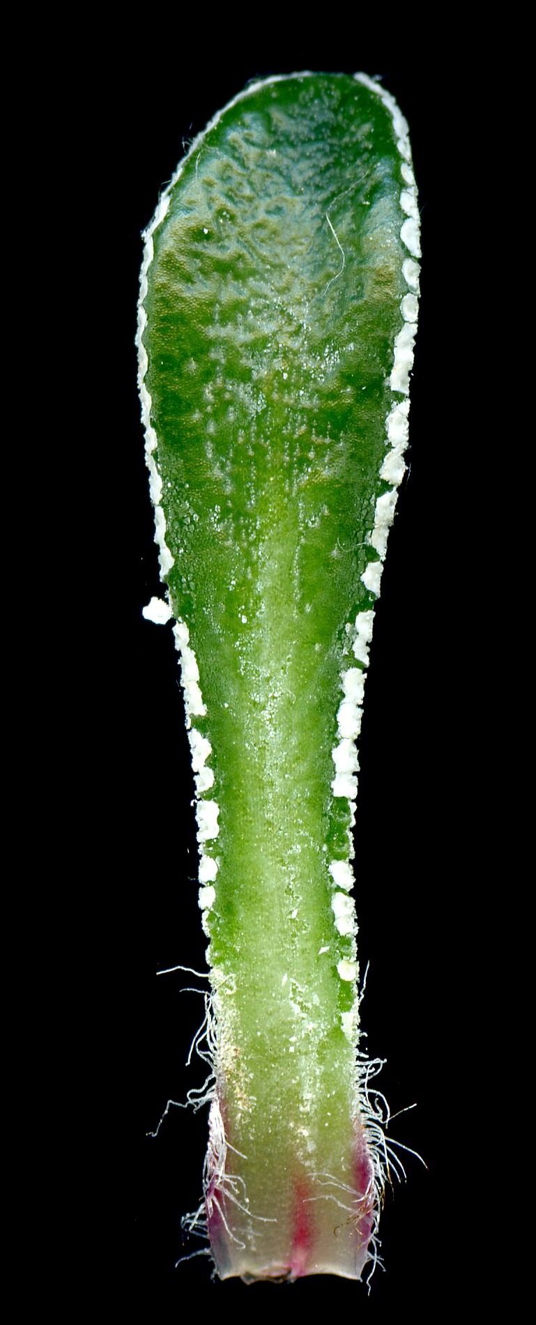 Grundblätter spatelförmig, 12 - 30 mm lang, 4 - 6 mm breit, steif, abstehend oder zurückgebogen, am Rand mit Kalk ausscheidenden Grübchen