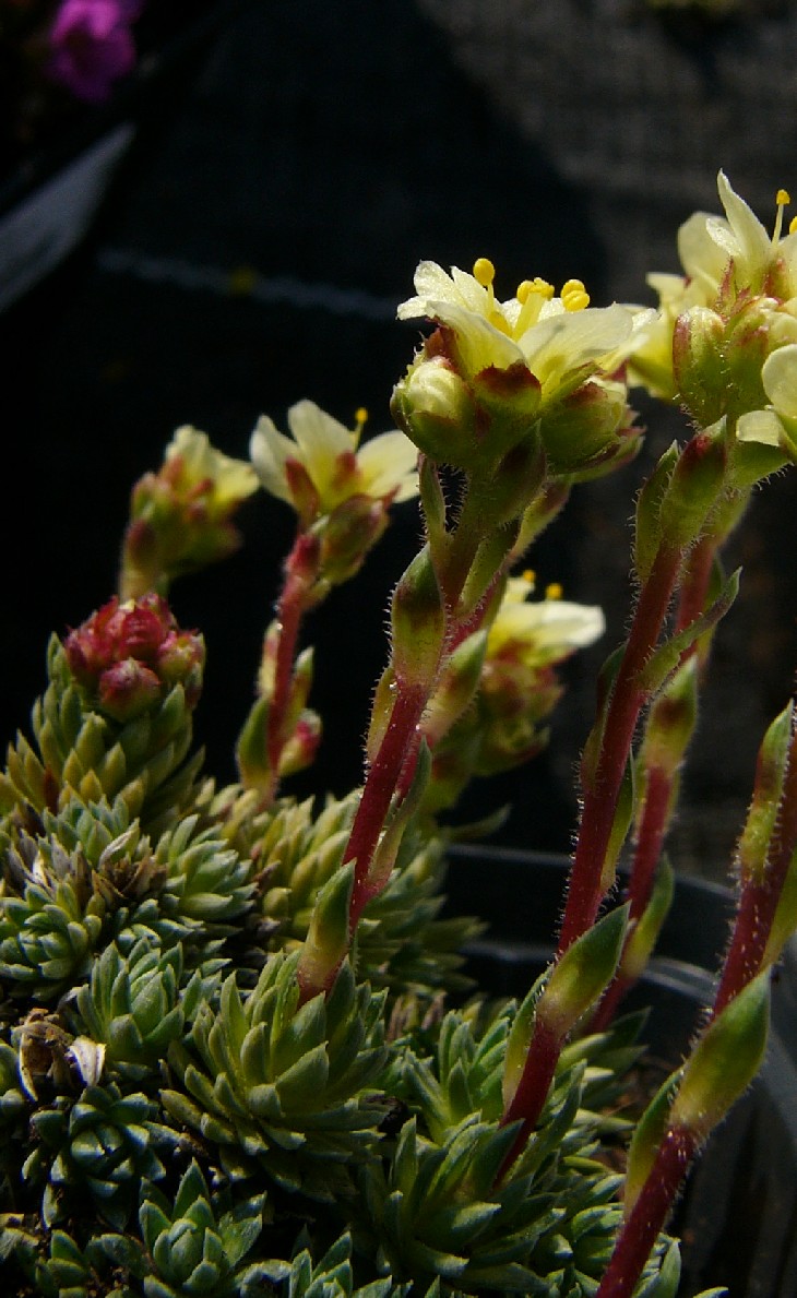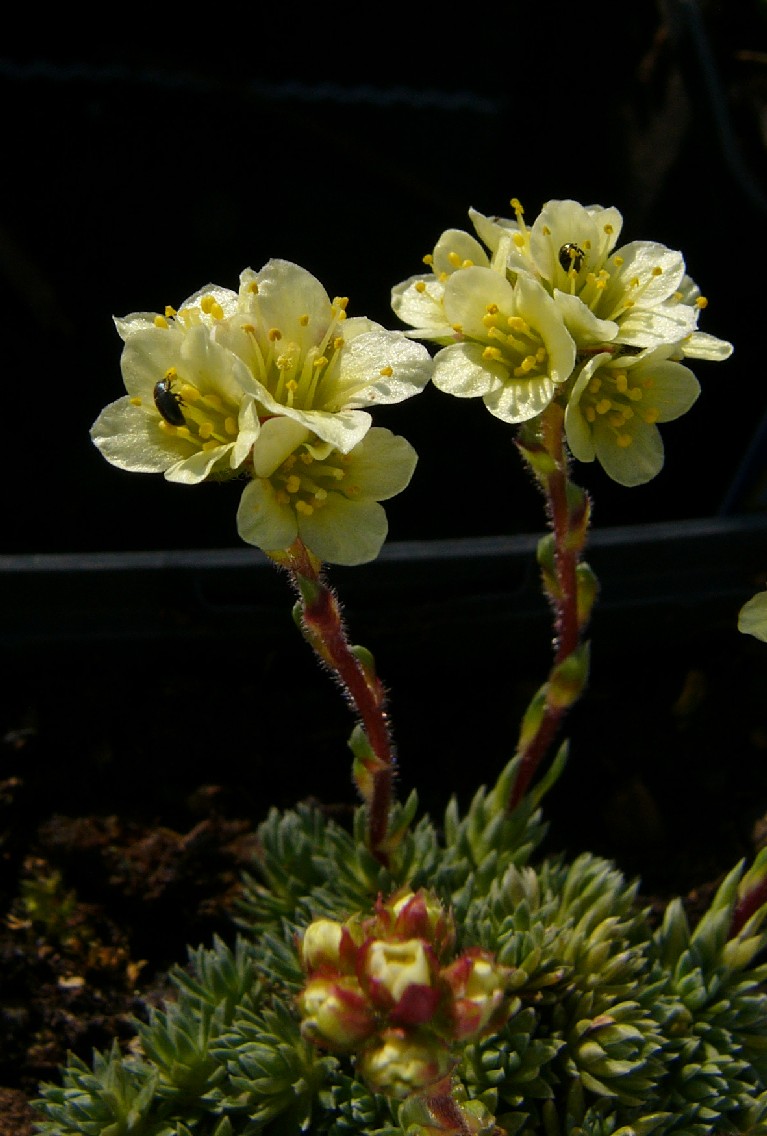 III - IV, Steingärten Hybride Saxifraga burseriana (Blüten weiß, Blätter hart) x Saxifraga sancta (Blüten goldgelb, Blätter weich) Synonyme: English