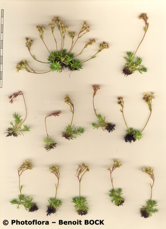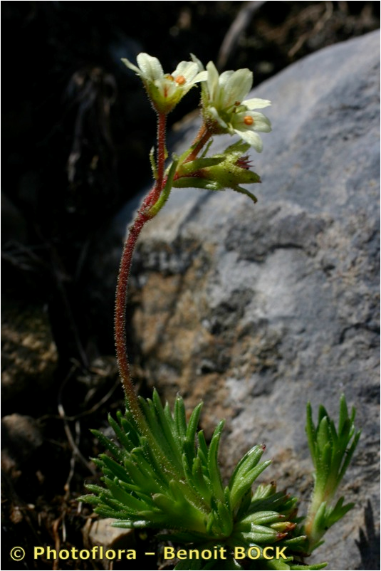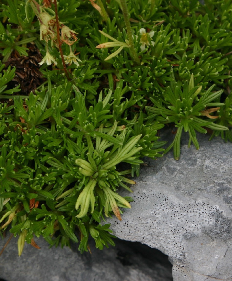 Saxifraga - Pflanze drüsig behaart, Polster oder Rosetten bildend, Blütenstand wenigblütig, Blüten gelb, Kronblätter breiter als die Kelchblätter, Blätter 3- lappig, ohne Stachelspitze
