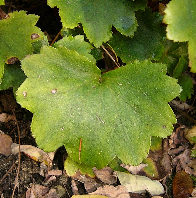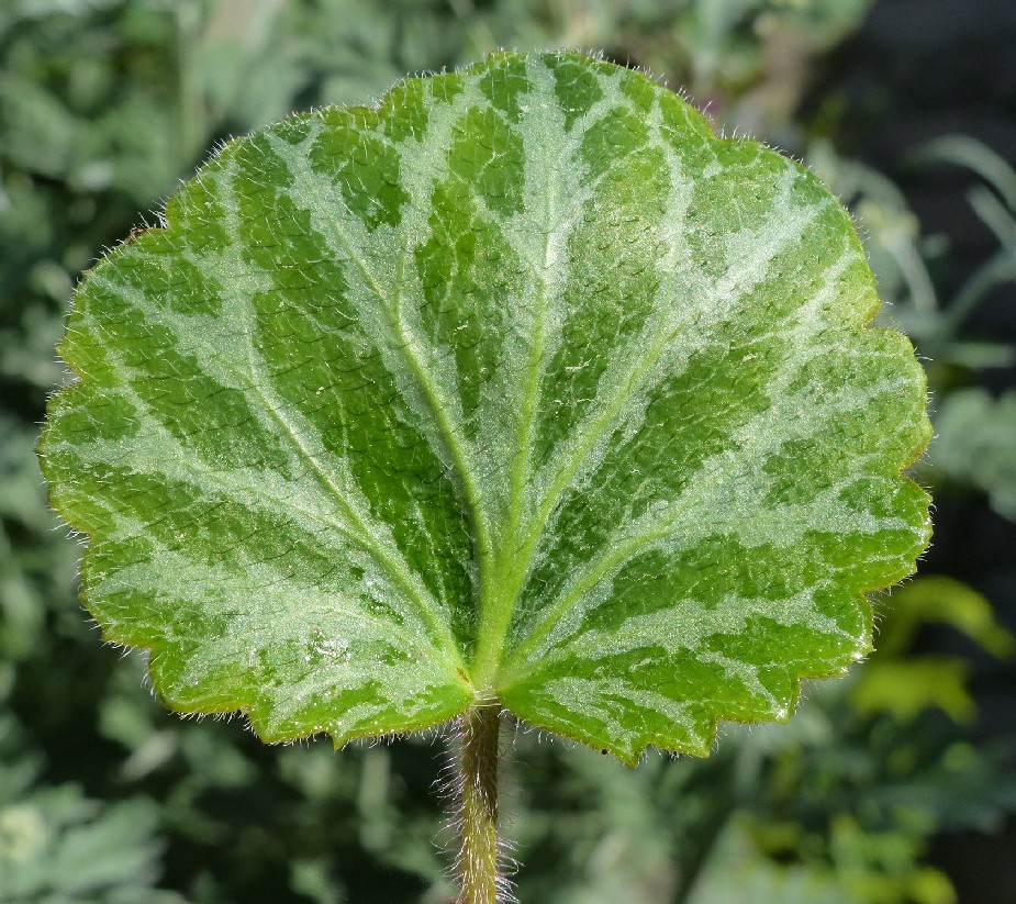 Grundblätter lang gestielt, Blattspreite 15 - 75 mm im Durchmesser, rundlich bis nierenförmig, stumpf gekerbt, langhaarig
