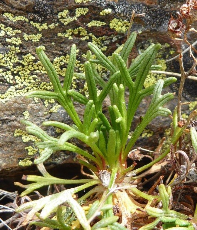 Grundblätter kahl, 7 - 20 mm lang, 4 - 12 mm breit, handförmig geteilt, mit 3 - 5 Lappen, am Grund keilig, mittlerer Lappen der Grundblätter kurz (3 - 6 mm lang, 0,5 - 1 mm breit), oberseits mit 1 feinen Furche, Blattstiel viel breiter als die Blattlappen, manchmal so breit wie die Blattspreite