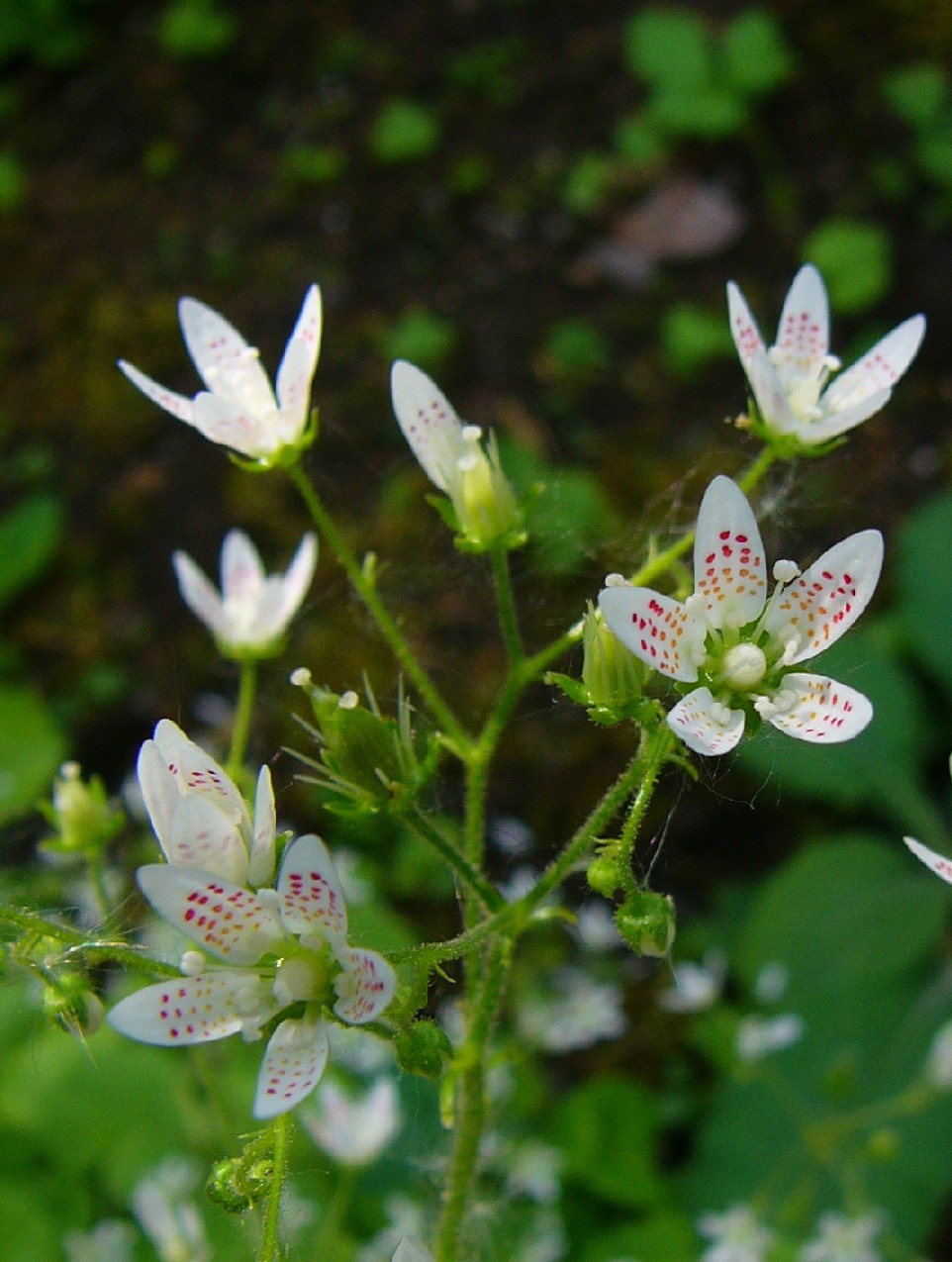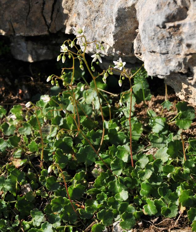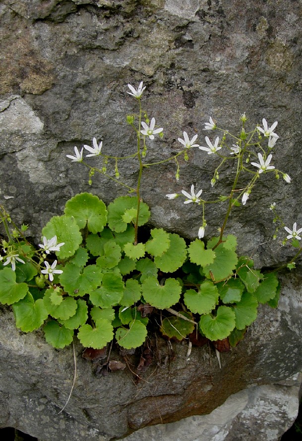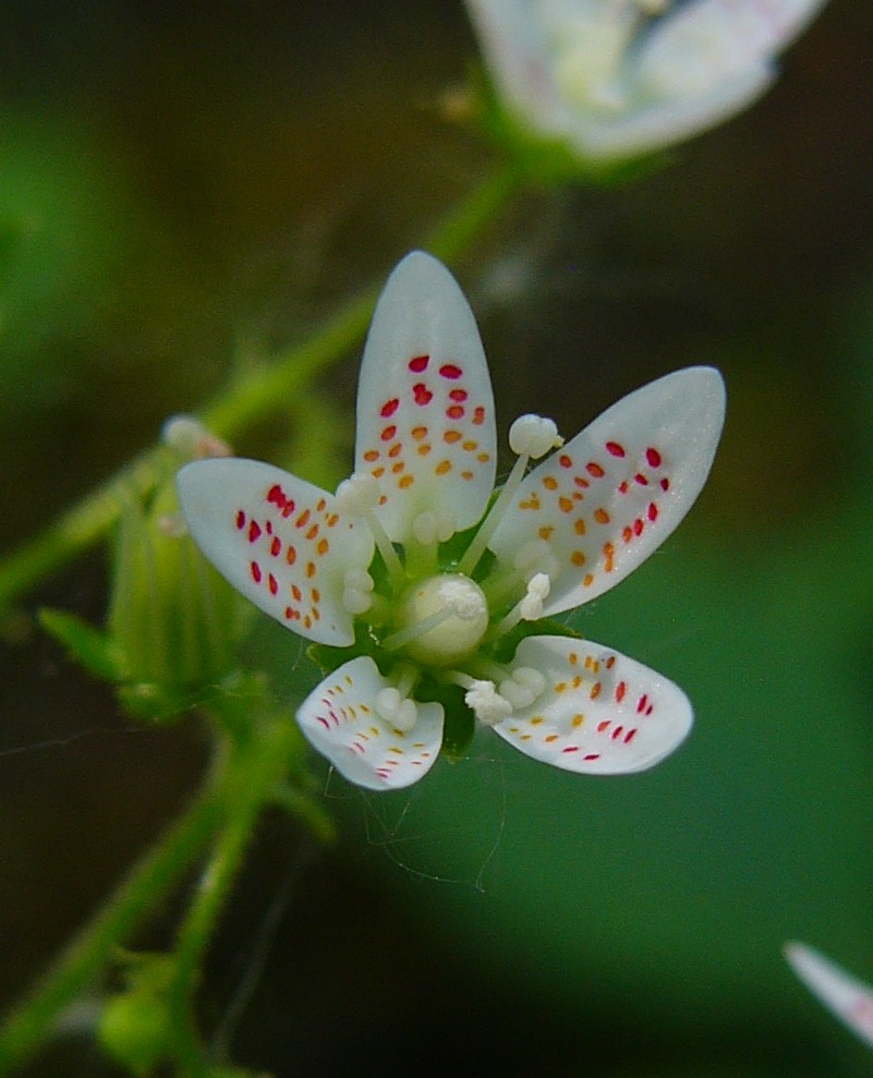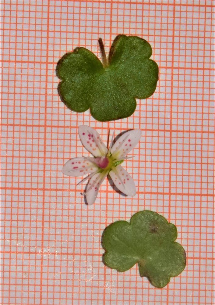 Steinbrech - Blüten weiß, mit roten und gelben Punkten, Kelchblätter aufrecht oder abstehend, Blätter weich, rundlich, nicht kalkausscheidend