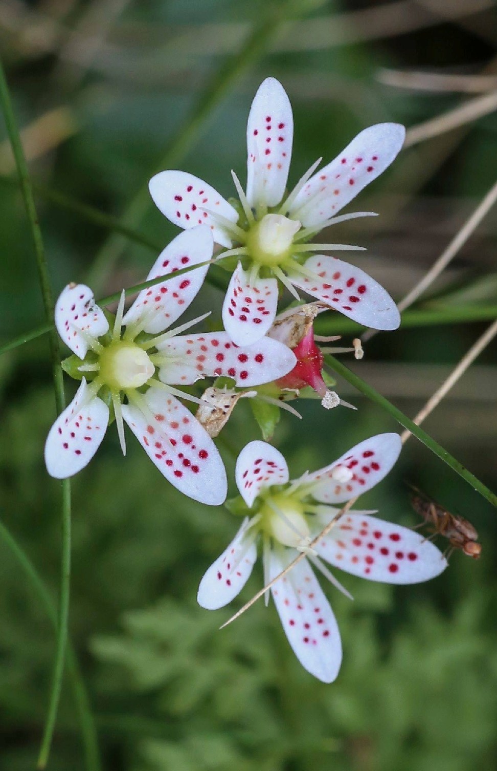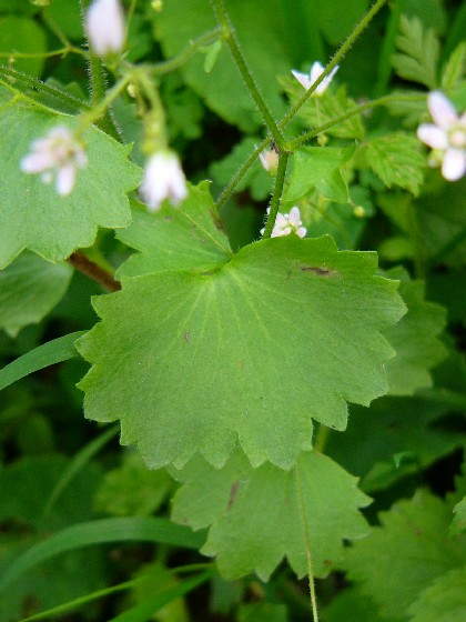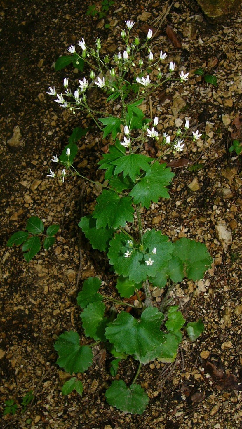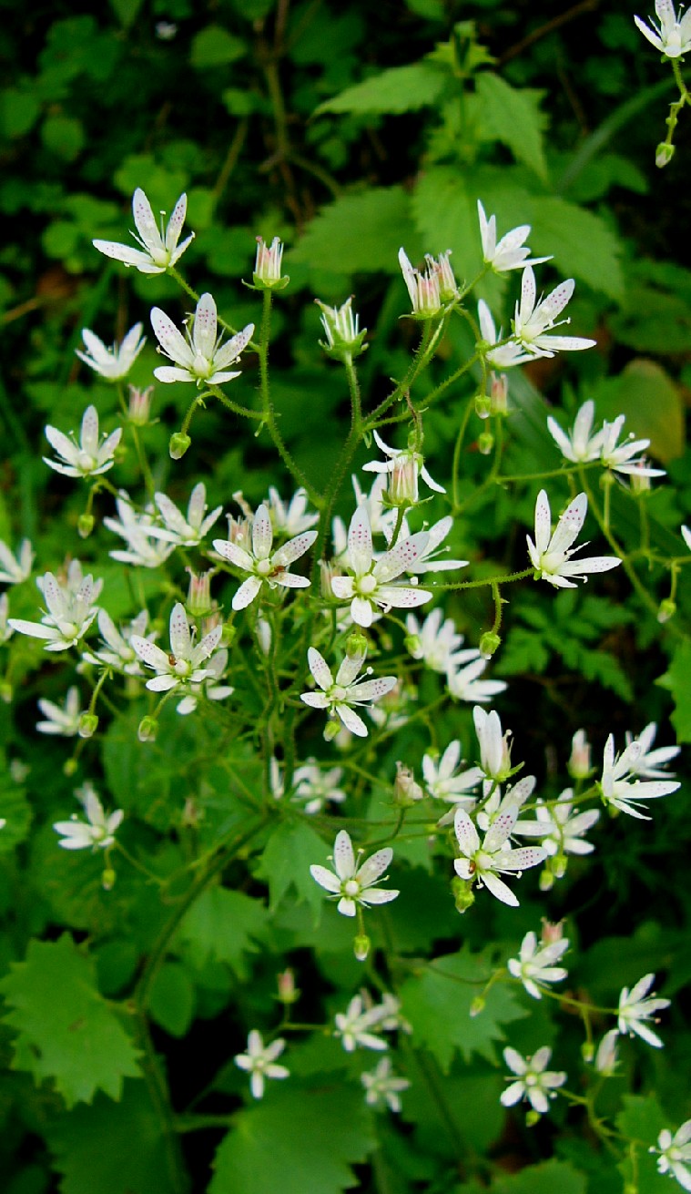 Steinbrech - Blüten weiß, mit roten und gelben Punkten, Kelchblätter aufrecht oder abstehend, Blätter weich, rundlich, nicht kalkausscheidend